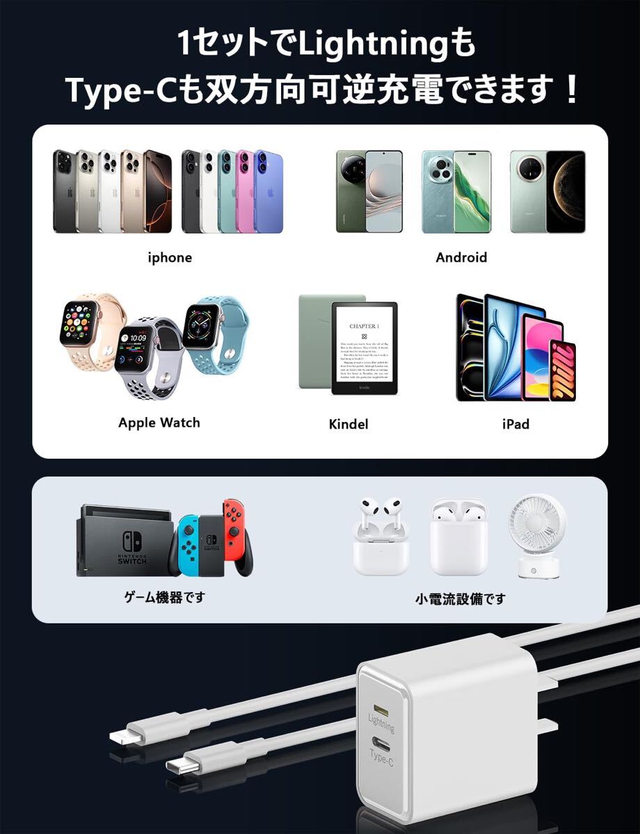 【幅広い交換性】:Type-CやLightninポート搭載の充電器で、iPhone各機種、ipad/ipodなどのデバイスだけでなく、iPad Pro/Air iPad mini6 スイッチ Switch MacBook HUAWEI Galaxy Sony Pixel AndroidなどType-c機種に繋いで充電やデータ転送、同期が可能です。2M充電ケーブル1本付きますので、新幹線や飛行機など、移動中にも便利に使えるのは2mケーブルは最適です。この充電器セット一つあれば、ご自宅や職場などに置いたり、旅行や出張などの持ち運び用の予備とするなどの場用に大活躍!