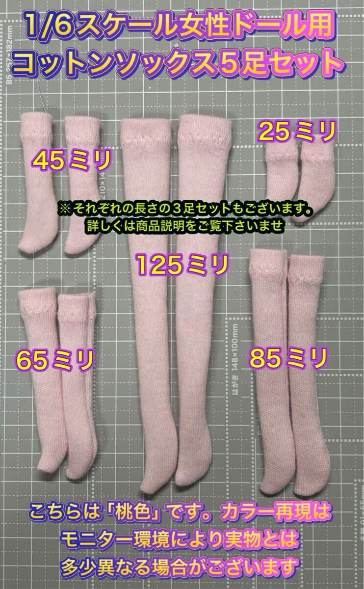 リカちゃん、ジェニー、ネオブライス、アイシードール 、オビツ27女性ボディ、ハッシュタグボディなどが着用出来る、ごくシンプルな綿のソックス長さ違い、平置きで約125ミリ、85ミリ、65ミリ、45ミリ、25ミリの5足セットです。