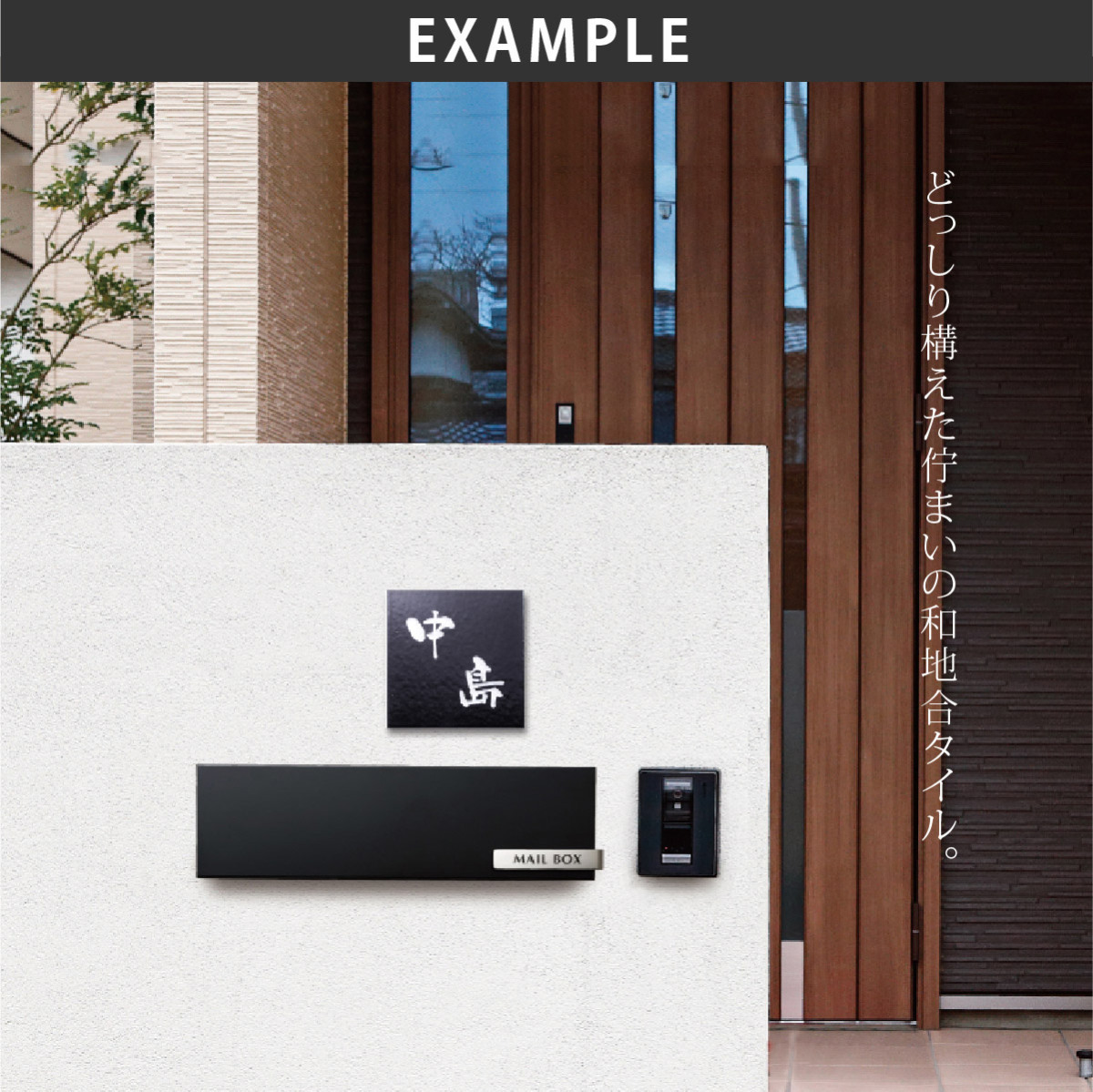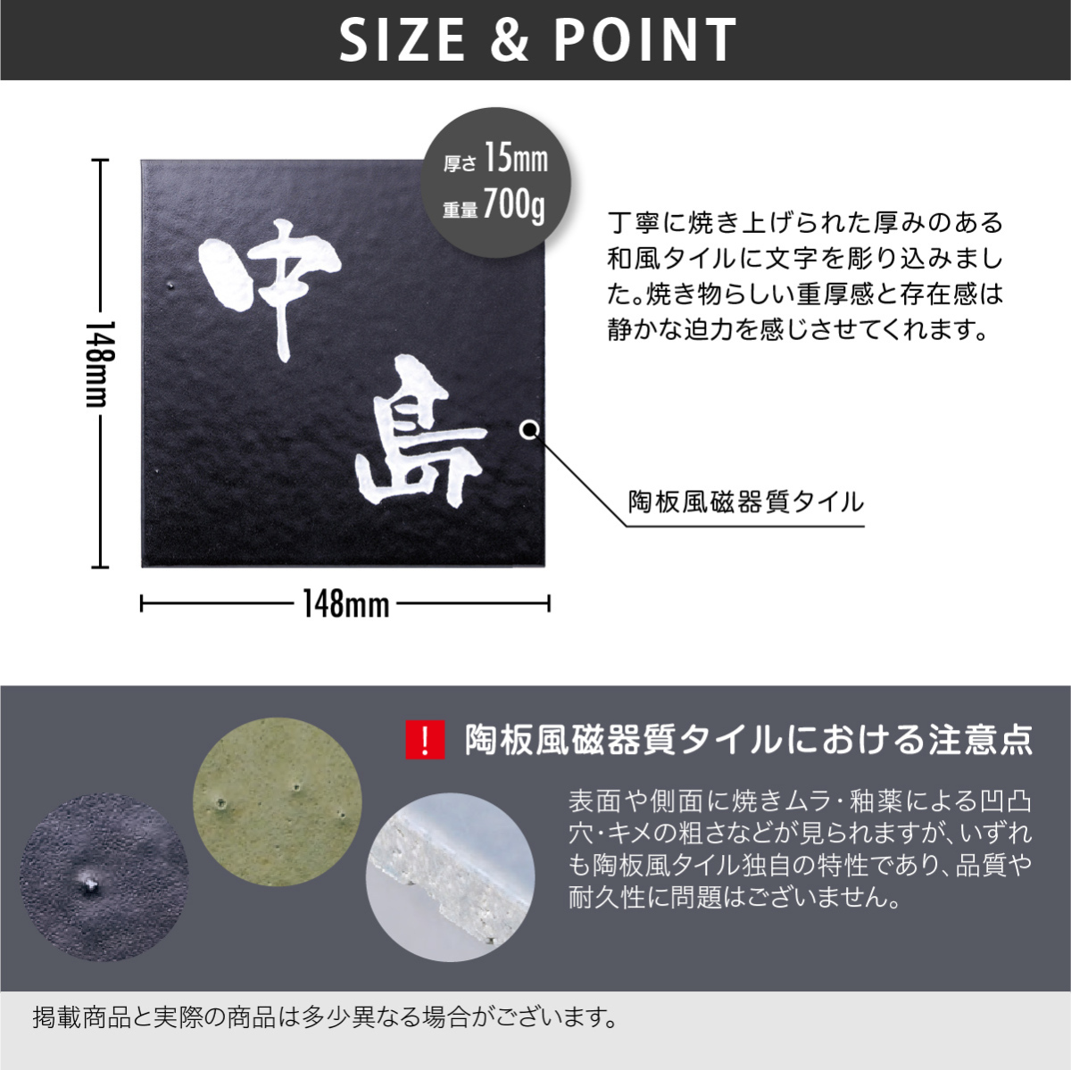 商品詳細 | 丁寧に焼き上げられた厚みのある和風タイルに文字を彫り込みました。焼き物らしい重圧感と存在感は静かな迫力を感じさせてくれます。 |