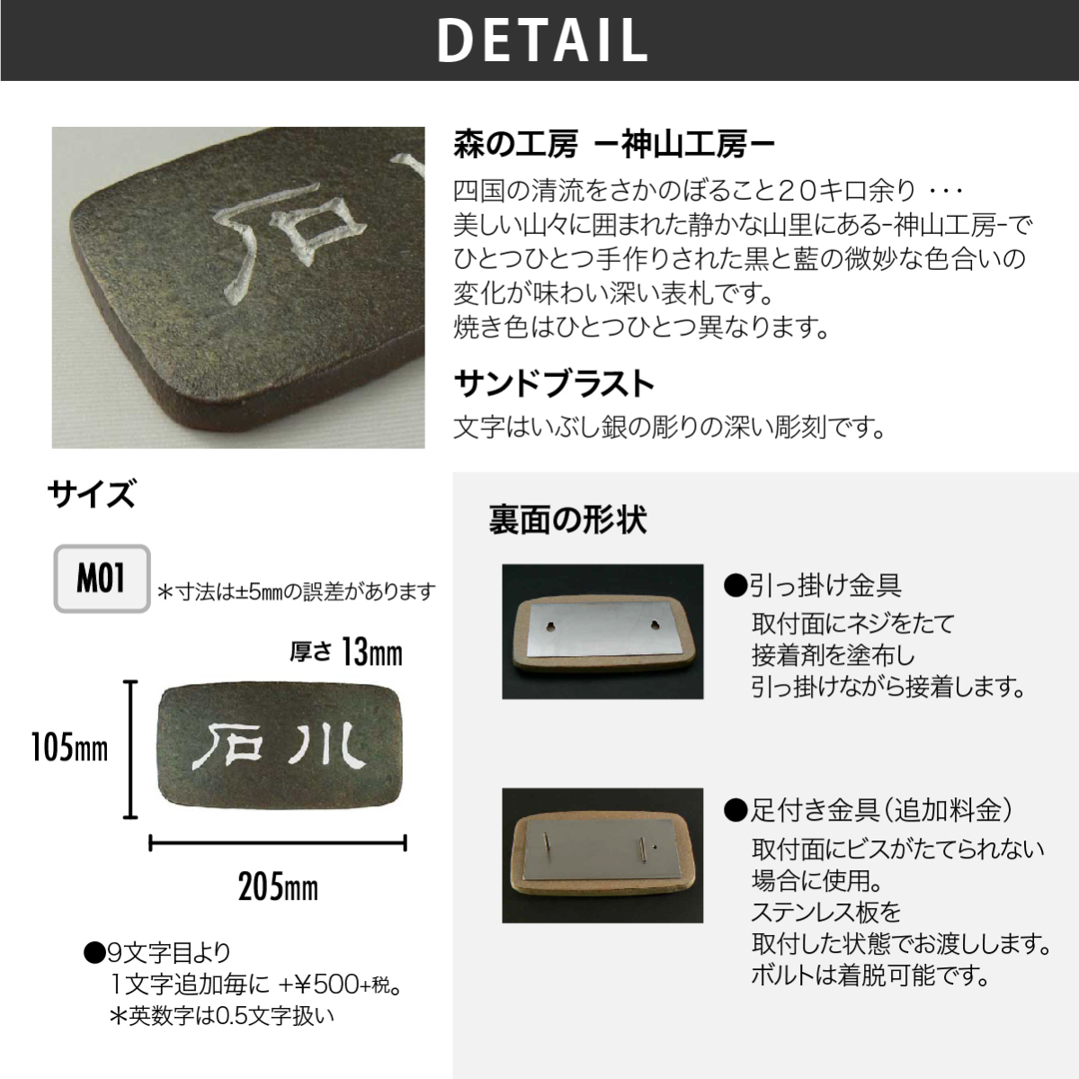 商品詳細 | 四国の清流をさかのぼること20キロ余り ・・・ 美しい山々に囲まれた静かな山里に -神山工房-はあります。森の工房と名付けた当社の焼き物表札シリーズはこの工房で手作りされています。四季を感じ、自然の動植物とふれあうことのできるこの場所で、陶芸家の高島さんご夫妻のつくる作品には「ほっと」心がいやされる温かさがあります。 |
