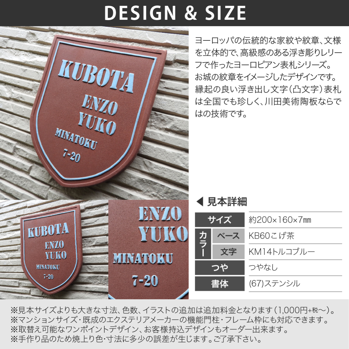 | 商品詳細 | ヨーロッパの伝統的な家紋や紋章、文様を立体的で、高級感のある浮き彫りレリーフで作ったヨーロピアン表札シリーズ。お城の紋章をイメージしたデザインです。縁起の良い浮き出し文字(凸文字)表札は全国でも珍しく、川田美術陶板ならではの技術です。 |