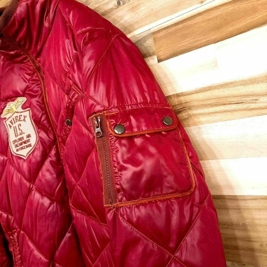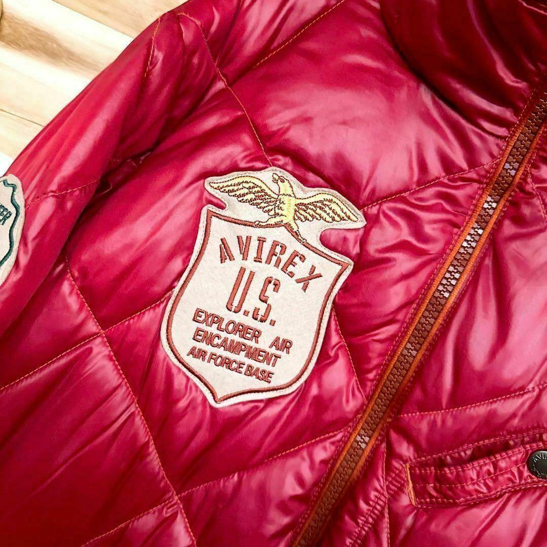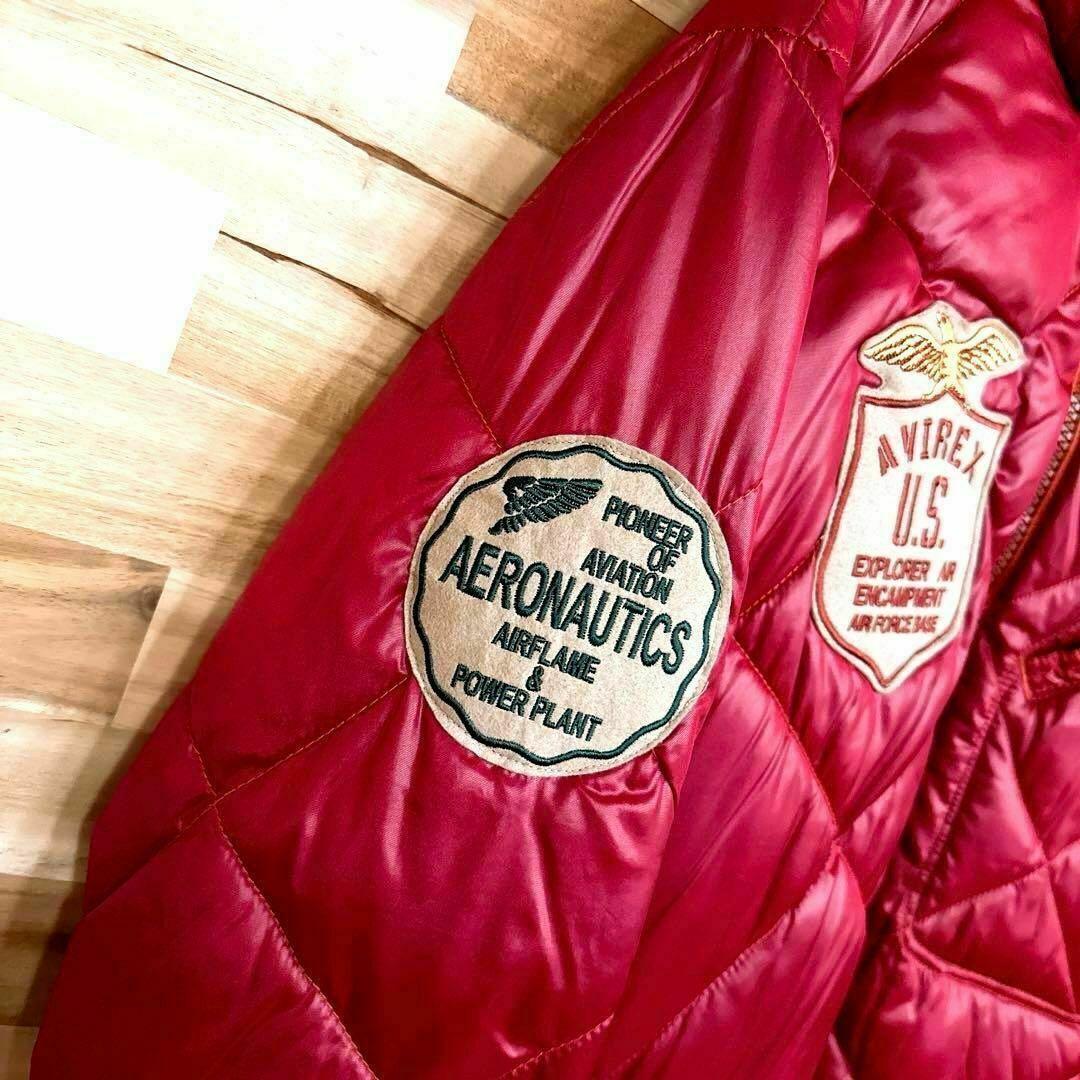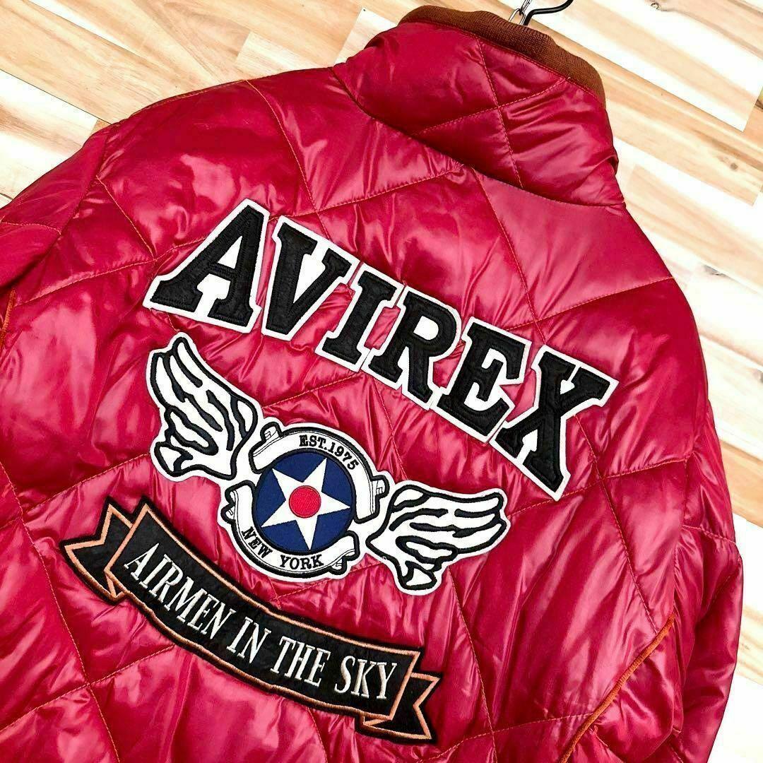 フロントと右腕には雰囲気あるオリジナルワッペン、背面にはブランドネームとエアホースマークを組み合わせた大判ワッペンをレイアウトした力強いデザイン。表地は、光沢感をまとったダイヤモンドキルトのナイロンで仕立てられ、軽量でありながらハイネック仕様など、しっかりとした防寒性、保温性を備えたAVIREXのジャケットです。バイクに乗られる方、バイカースタイルとの相性も抜群な逸品です。※LGスタイラーにて除菌リフレッシュ・スチームクリーニング済みです。