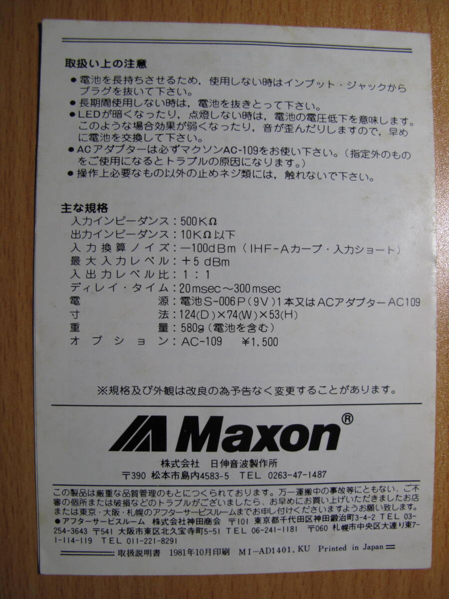 | MAXON/Analog.Delay・取説パンフ・1部・1980年代?・汚れ痛み折れ多し | |