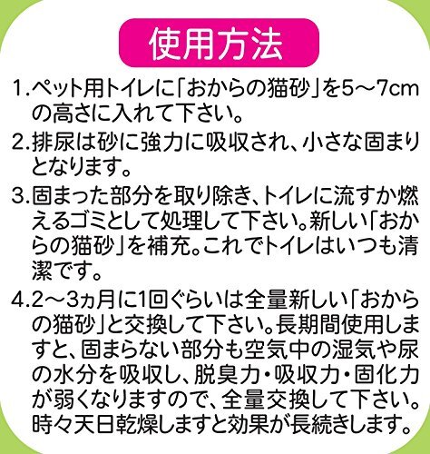 「常陸化工 おからの猫砂グリーン6L×4個 (ケース販売)」▼4952667433515▼(商品説明)・グリーン 6L×4個 ・・Size:6L×4個・本体サイズ (幅X奥行X高さ) :27×40×6.5cm・本体重量:4kg・内容量:6000ml・原産国:日本説明 商品紹介 おからを主原料とした固まって流せる猫砂です。水に溶けやすく水洗トイレに流せる。燃えるゴミとしての処理やコンポスト(堆肥)化して再利用できます。しっかり固めて臭いをとる。おからの臭いを抑えたライトグリーンの粒。 使用上の注意 飲食物ではありませんので、幼児やペットに食べさせないでください。猫・犬用トイレ砂以外の用途には使用しないでください。 原材料・成分 おから・炭酸カルシウム・のり剤・抗菌剤・酸化防止剤 使用方法 開封後はよく密閉して、乾燥した場所に保管してください。暖房器具等の近くに置かないでください。