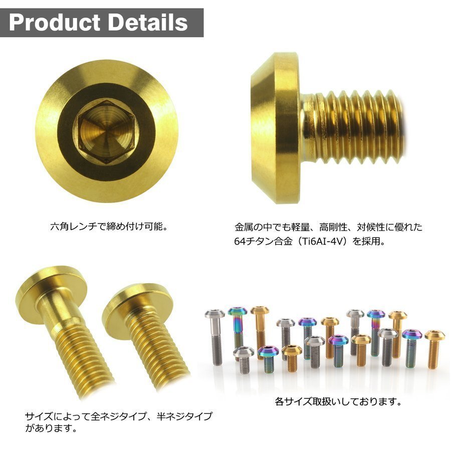 | 64チタン テーパーヘッド ボタンボルト(六角穴付きボルト) 金属の中でも軽量、高剛性、対候性に優れた64チタン合金(Ti6Al-4V)を採用。 テーパー切削加工を施し、ドレスアップに最適なボルトです。 |