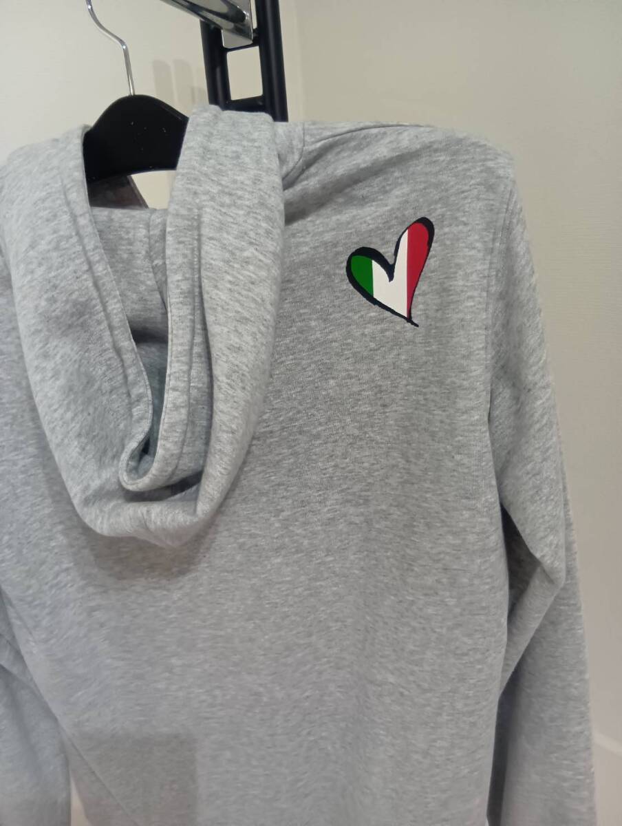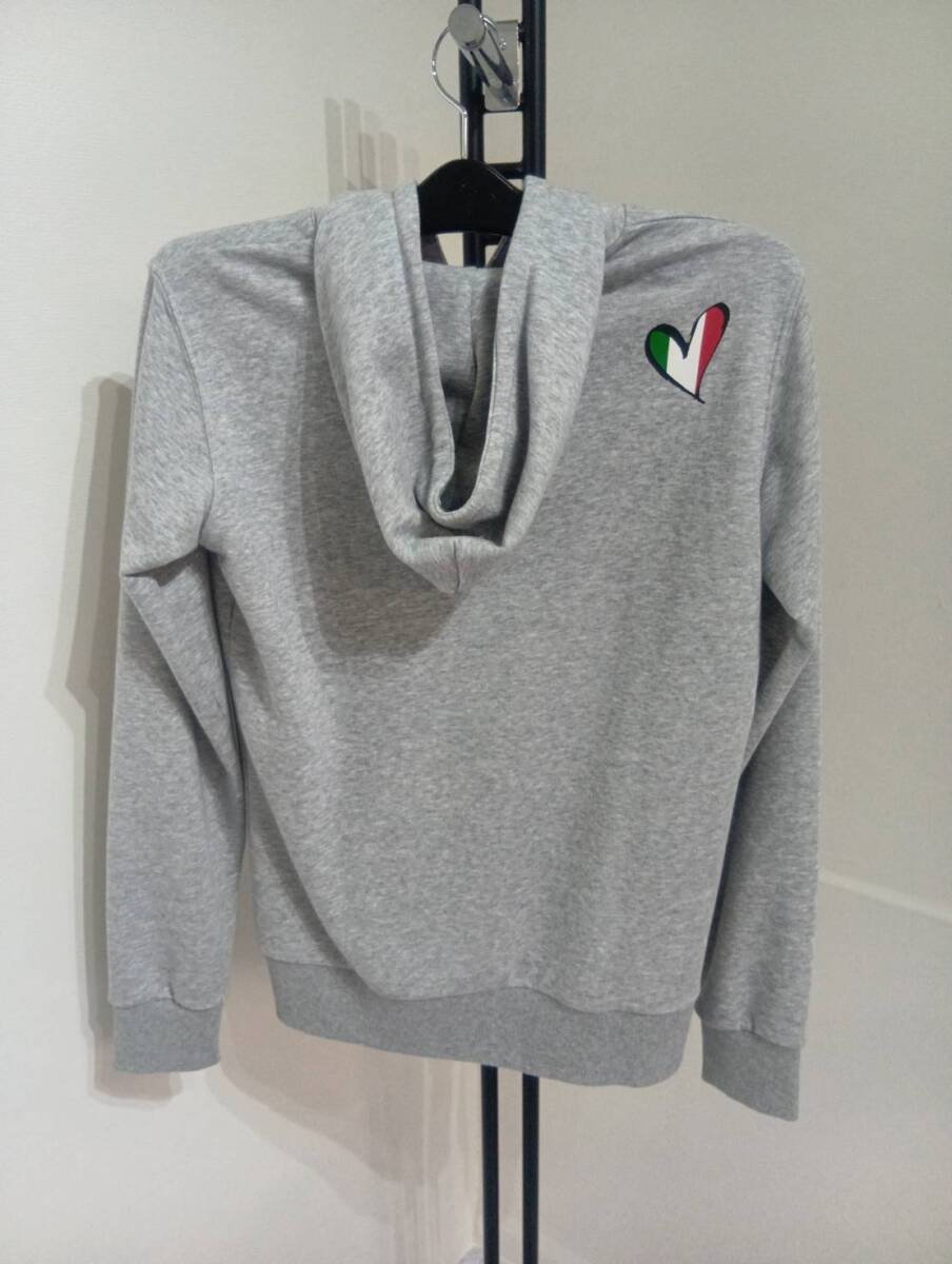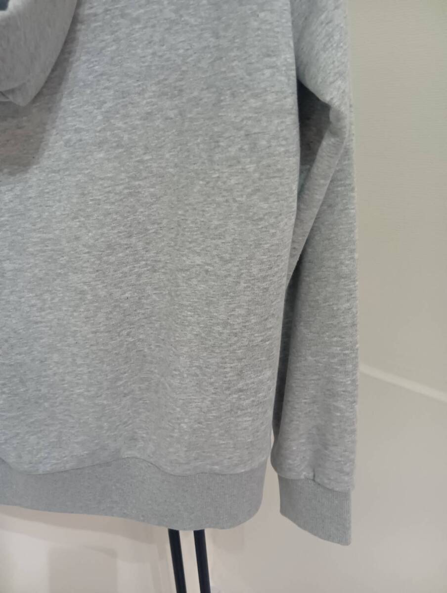 かぶるタイプのトレーナーパーカーで、グレーのスウェットです。バックプリントのハートが可愛いですね