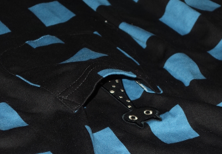 ・右後ろポケットから顔をのぞかせている黒猫のアップリケがデザインのポイント