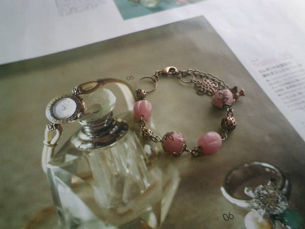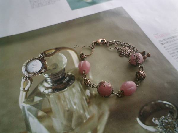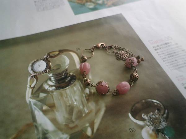アート・クチュール・・シリーズです♪オリエンタル主義・・個性的なアンティークビーズのブレスレットです♪モーヴピンクのメロンビーズは10×9ミリ位です♪シックな座金や透かしチャーム、デザインチェーンでおめかししてさりげなく女の子しています♪長さは全長23センチ位で調節自由です♪♪お揃いのネックレスも出品しています♪♪シンプルで長く着けていただけるデザインを考えて作りました♪ハンドメイドをご理解頂いてノークレーム、ノーリターンでお願いします