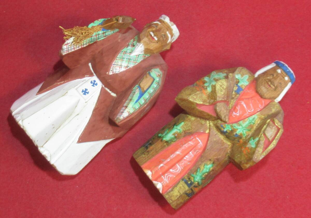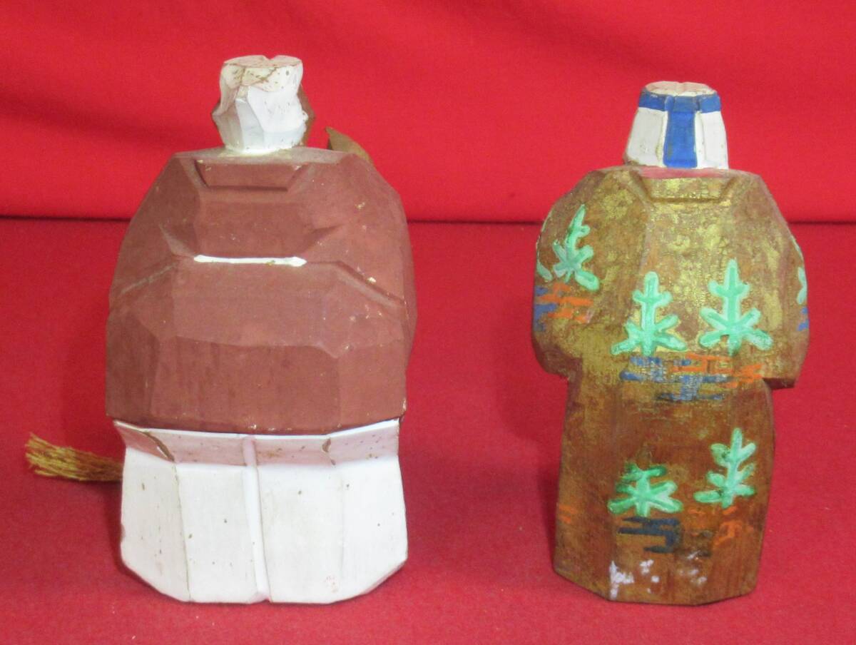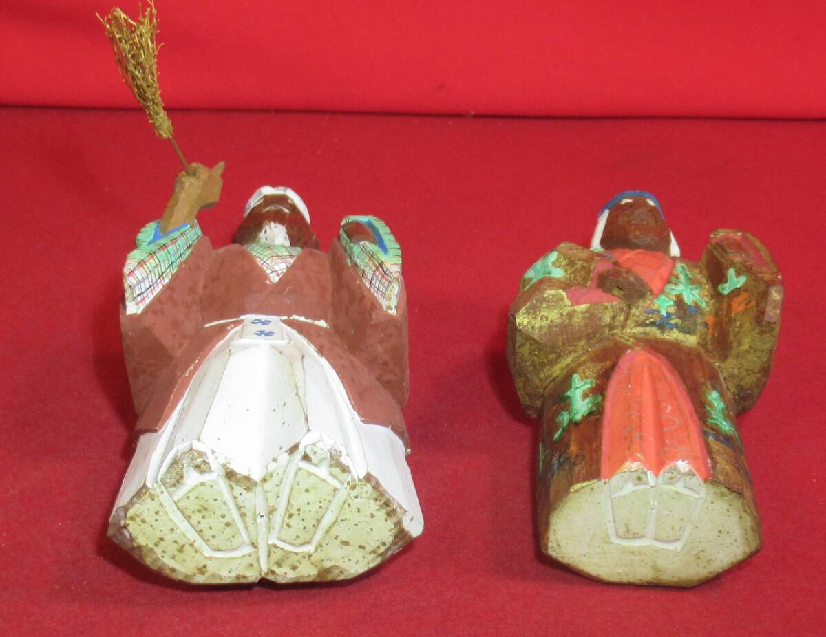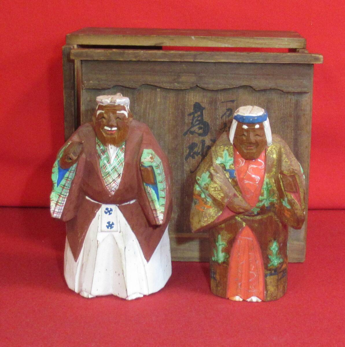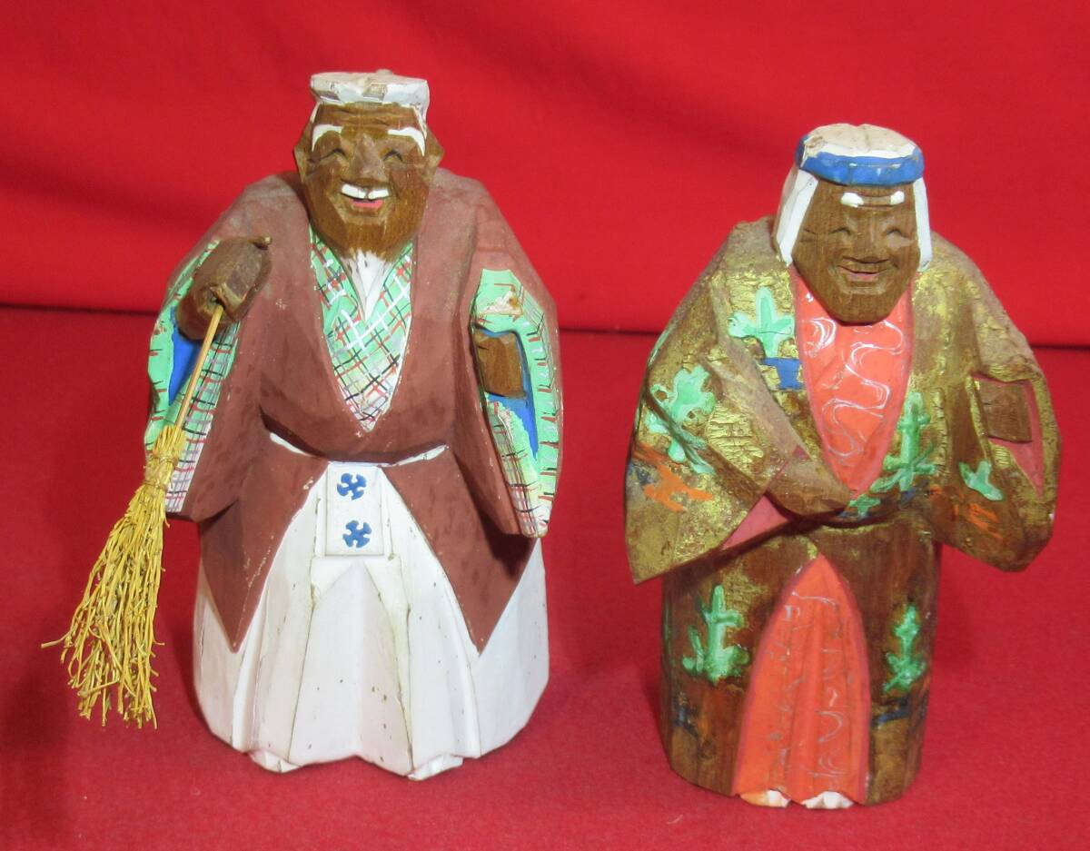 奈良一刀彫 奈良人形『木彫高砂一対(高さ12㎝)春日有職』共箱 奈良人形師「杜寿作」木彫彩色人形 仏像