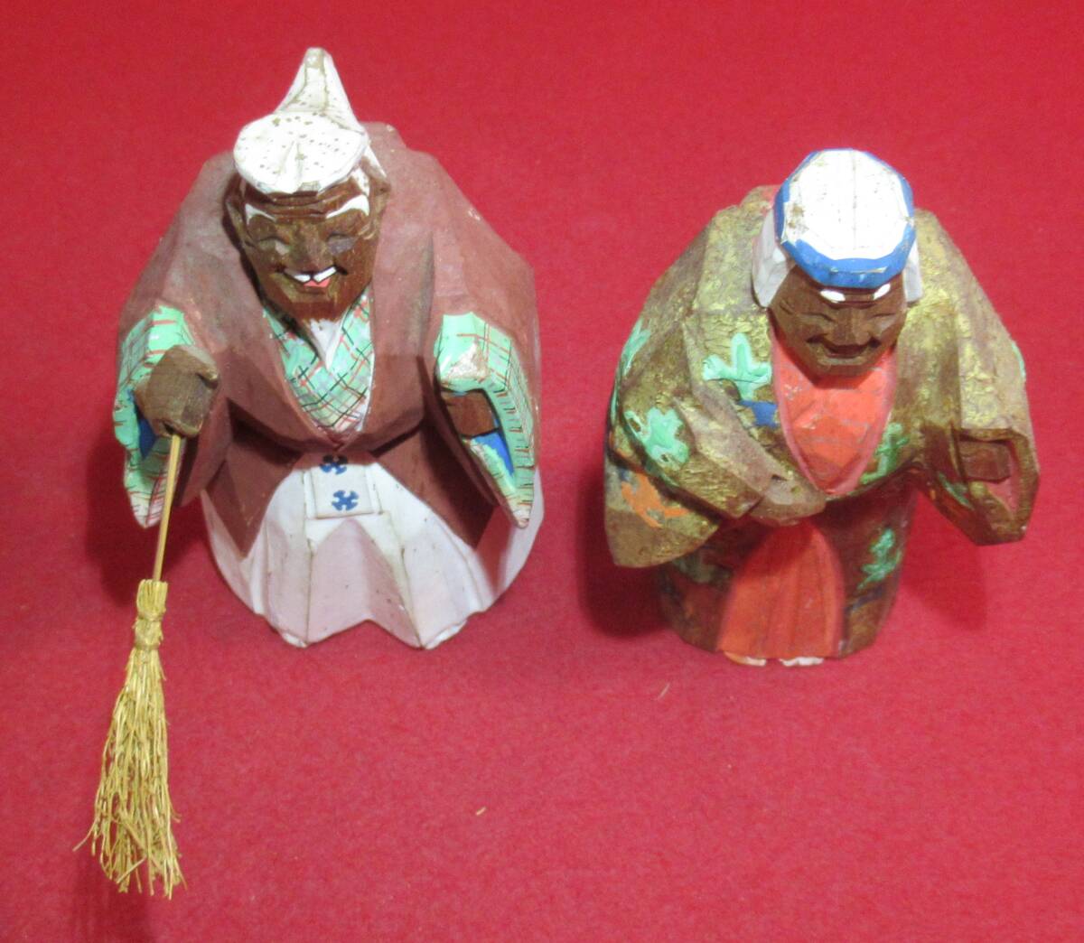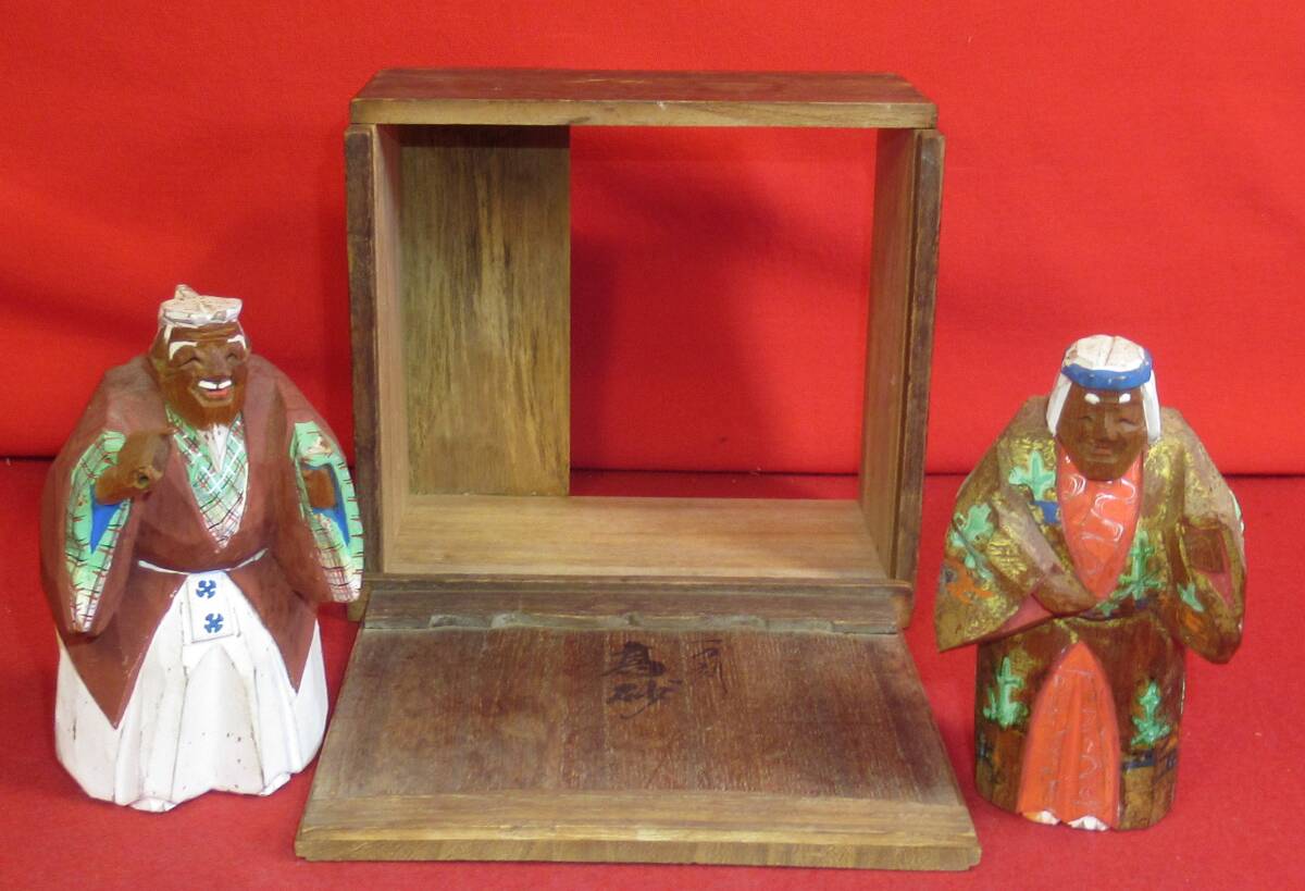 サイズは、高さ12,3㎝と11,7㎝です。経年の汚れ・色剥げはありますが、割れ等のダメージとなるような傷みは見当たりません。翁の持ち物が傷み有です。箱の裏側が欠損です。画像でご確認ください。