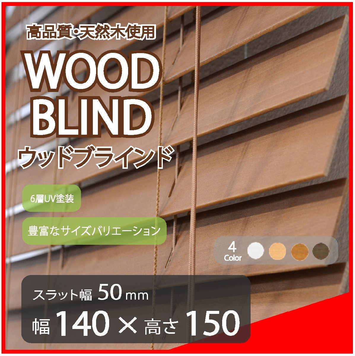 ● 6層UV塗装の高級スラット(羽根) ※1枚無垢のバスウッドスラットに高級家具並みの6層コートを採用しています ● スラット幅(羽根)2種類×68種類のサイズバリエーション×4カラーを取扱いしております ※上記により商品アイテム点数が多い為、常に全てを出品しておりませんので お探しのサイズがございましたら下記の表をご覧頂き、ご質問欄よりお気軽に在庫お問合せ下さい ● 全国一律 1,200 円 ※ 沖縄・離島等で中継料金が発生する場合、別途お見積りとさせて頂きます ● 安心できる1年間の製品保証・サポート付き ※お買求め頂いた商品は、お買上げ日から1年以内に通常範囲内での製品の不具合等に関しまして、 無償にて修理、交換をさせて頂く保証期間を設けさせて頂いております 但し、使用して消耗するスラット・コード類の経年変化による変色や変形等については保証対象外 とさせて頂いております。また使用状況によっては有償となる場合もございます |