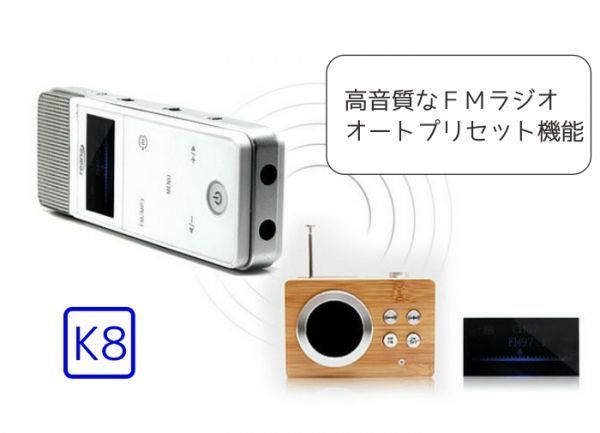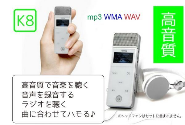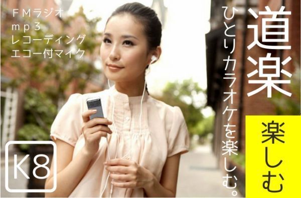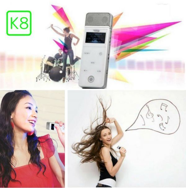 商品名 ハモリ・カラオケプレーヤーK8 録音/再生 mp3プレーヤー ステレオマイク 商品説明 mp3、WMA、WMVファイルを再生しながら、FMラジオの音楽に合わせながら、録音後の音声データに重ねるように、エコーのかかったマイクで歌うことが出来ます。 いつでもどこでも楽しめる小型のカラオケマイクです。 ボーカル無しの曲などではかんたんにカラオケになります。そのままスピーカーにつなげば、本格的な高音質カラオケステムになります。シンプルかつ高機能なK8です。つかってみると、意外と楽しいです。 このすばらしいカラオケシステムがこの価格で登場!ワンボタンで会議用の録音機としても便利です。 そのほかにもmp3プレーヤーとして、FMラジオ(録音可能)として、会議録音も出来ます。 マイク機能を使えば、発表の場での拡声器としても使用できます。 エコー(スライド調整付)があるので、歌を上手に聞こえるようになります。 ステレオマイクなので大人数で歌うと左右の立ち位置がはっきりします。 ●充電式(USB端子充電) ●microSDカード必要(別売) ●シャッフル再生可能、ディレクトリ再生、1曲リピート、A-Bリピート機能 ●日本語表示メニュー ●ステレオマイク ●エコー度合い、マイク音量調整 ●LRスイッチでボーカルを消すことも可能です。(曲によってできる場合とできない場合がございます。) LRでチャンネルを分けている場合可能となります。 ※音楽再生+マイクではミキシング録音できません。(録音は録音機能のみ)2台あればミキシング録音が可能です。 ※製品仕様は都合により予告なく変更されることがございます。 付属品 イヤホン、ステレオケーブル サイズ 約9.8×3.5×1.5cm 重量 約50g 生産国 中国