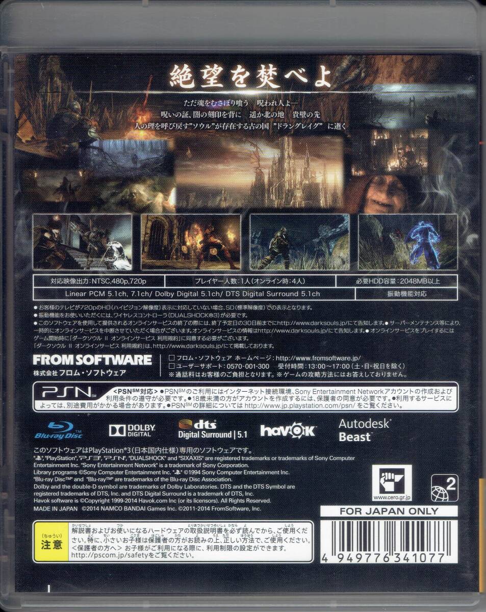 PS3ソフト「DARK SOULSⅡ」です。起動確認済み。マニュアル有。ケースに軽い擦れ、ディスク盤面に軽い擦れと僅かにキズあり。外観は並下~並、マニュアルは上、ソフト盤面は並下です。とりあえず遊んでみたい方向けです。配送はクリックポスト(簡易梱包)になります。