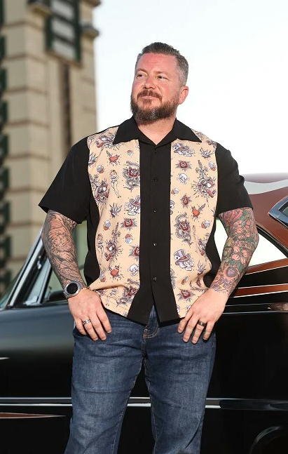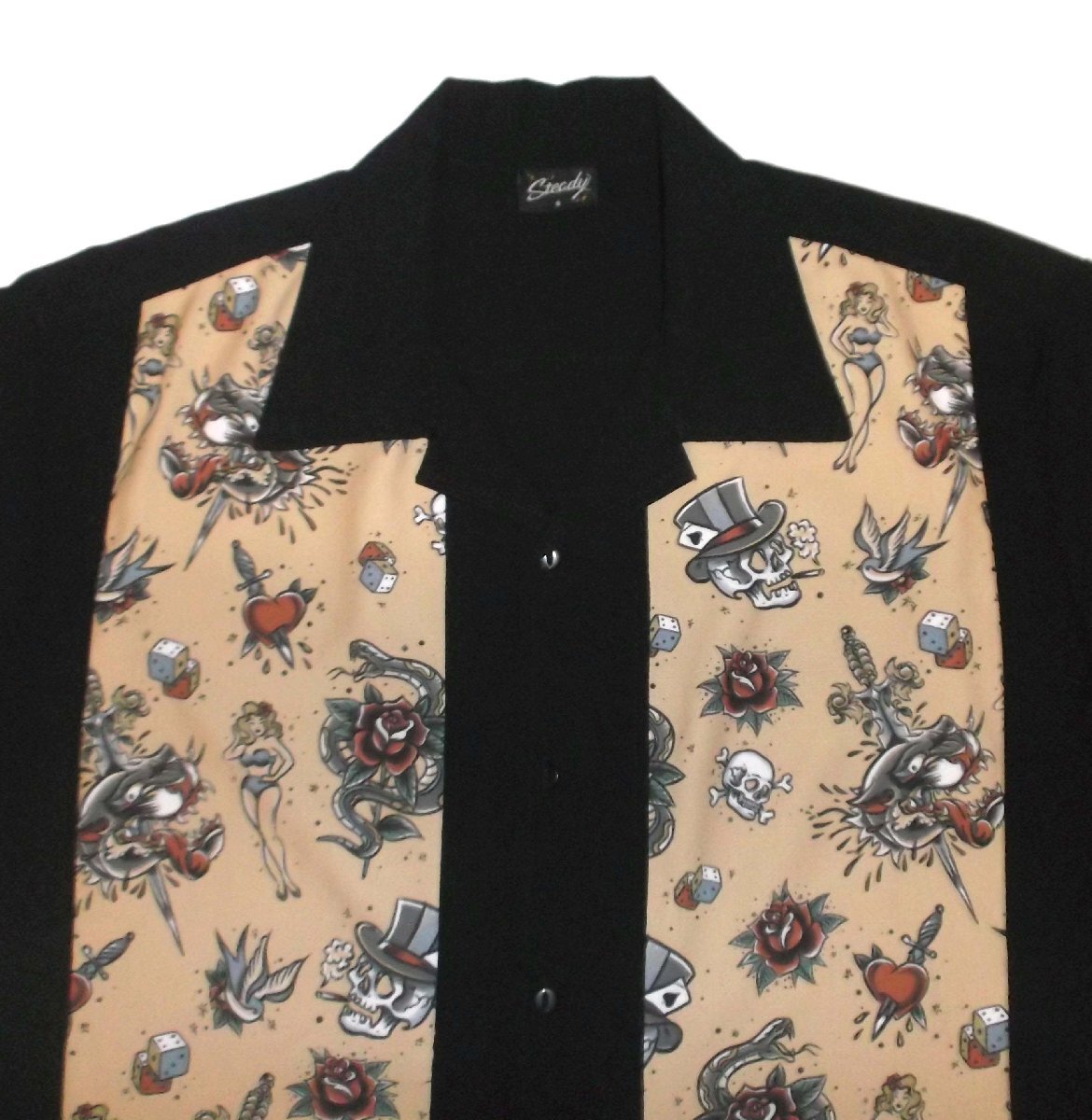 | Tattoo Print Double Panel Bowler This classic two-tone panel shirt features three retro starbursts embroidered on the left panel. Steady classic Tattoo print finally makes it's way on Steady Clothing bowling shirt! Black shirt with vintage tattoo flash on a tea colored background. COLOR: Black with sublimated panels MATERIAL: 100% Polyester Machine Wash Cold, Tumble Dry Low Made in the USA 1994年創業、LUCKY13 , Sourpuss Clothing , Sailor Jerry などと同様に、 ロックンロール、タトゥー、ホットロッドといった米アンダーグラウンドカルチャーにインスパイアされ、VINTAGE, Mid Centuryのテイスト濃いブランド「Steady Clothing Inc.」 Made in USAにこだわったヴィンテージ感覚のメンズ・レディースアパレル、その手のスタイルに精通した営業担当者から、ロックンロール・スタイルそのものな倉庫スタッフ、タトゥーマニアのオーナーまで、そのデザインがどこからインスピレーションを受けているかは一目瞭然です。 50s,ヴィンテージ・テイストの中にも常に「Steady-touch」で最新のスタイルを提供することを目標と掲げる「Steady Clothing」の、 最も得意とするミッドセンチュリー・テイストなダブルパネルのボウラーシャツ「Tattoo Print Double Panel Bowler Shirt」です。 ミッドセンチュリー・テイストな、ブラック・ベースのオープンカラーシャツに、オールドスクールのタトゥーフラッシュが散りばめられた、ベージュの2枚パネル切り替えし!! 新品・正規品 XLサイズ 180cm位の方~良いかと思われます。 肩幅56cm、着丈76cm、身幅68cm メール便送料¥250です。 ACE CAFE LONDON、LUCKY13、THRASHER、Sailor Jerry等~アメキャラ・企業ロゴ等ライセンスTシャツ、RATFINK関連品、バンドTシャツ等取り扱っております。 ** 他にも色々出品中です。 CWKTW IWhd | |||||||