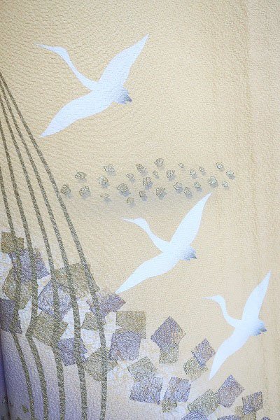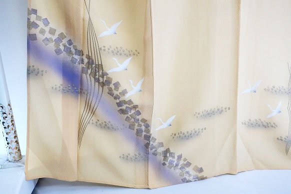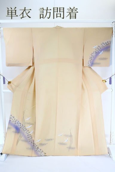 【送料無料】訪問着 単衣 クリーム 鶴 金彩加工 身丈163cm お洒落 フォーマル 仕立て上がり 正絹 m-6437 |