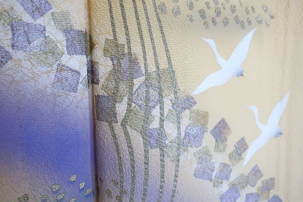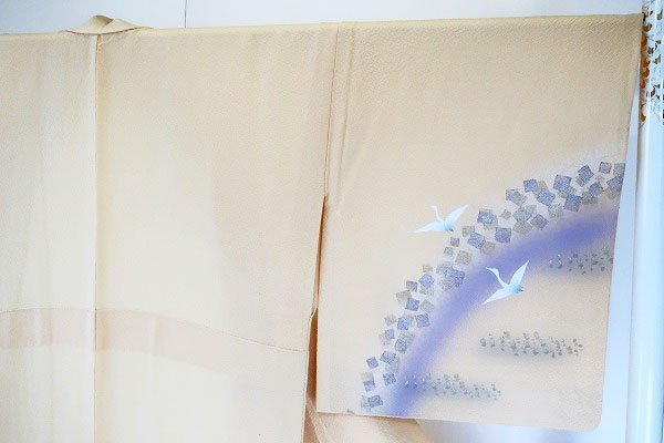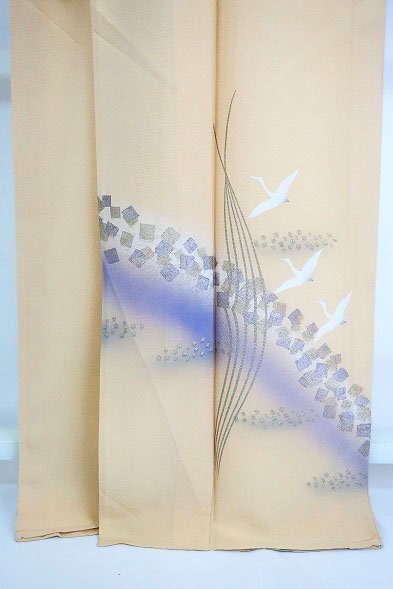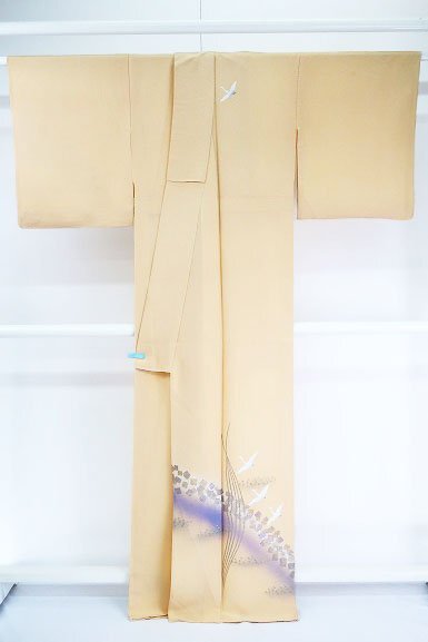クリーム色の絹地に鶴が描かれた単衣の訪問着です。 優しいクリーム色に金彩加工や紫色がアクセントとなり、上品な印象の一枚です。 習い事やお出掛けにいかがでしょうか。 担当:伊藤 |