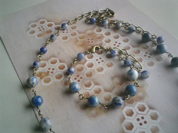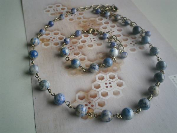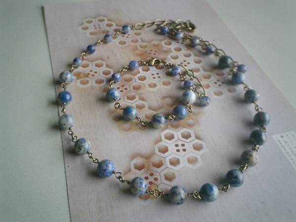 デニム・コレクション・・シリーズです♪初夏のブルー色・・爽やかなラピスのネックレスとブレスレット2本セットです♪♪深い藍色やブルーグレーや群青色がアートな表情のデニムラピスは6ミリと8ミリの丸玉です♪シンプルで合わせやすいデザインです♪ネックレスの長さは全長62センチ位で調節自由です♪チョーカー風にされても素敵です♪ブレスレットの長さは全長23センチ位で調節自由です♪♪同じシリーズのネックレスやブレスレットも出品しています♪♪シンプルで飽きのこないいつまでも着けられるデザインを考えて作りました!ハンドメイドをご理解頂いてノークレーム、ノーリターンでお願いします