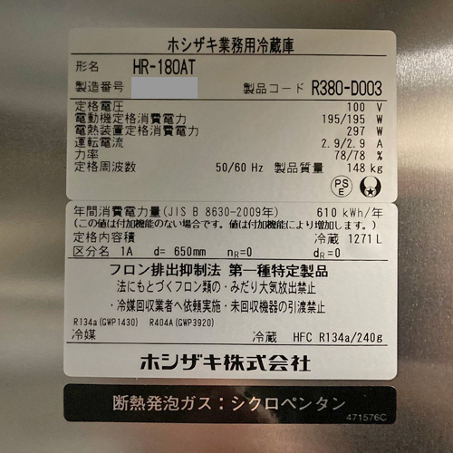 【業界最長1年保証】縦型冷蔵庫 ホシザキ HR-180AT 業務用 中古/送料別途見積