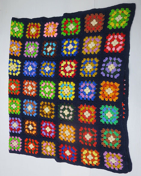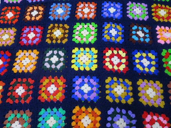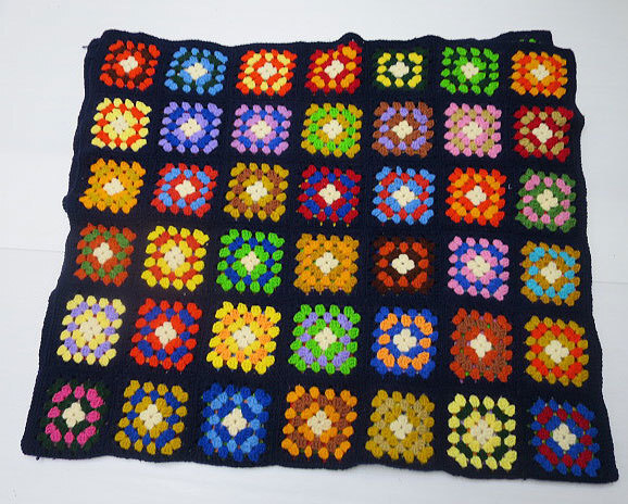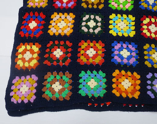 アメリカで買い付けの詳細は不明ですが70年代頃のハンドメイドのウールのラグでベットカーバー、こたつカバー等用途は多種多彩で約15cmの角の組み合わせで画像は2つ折りです。