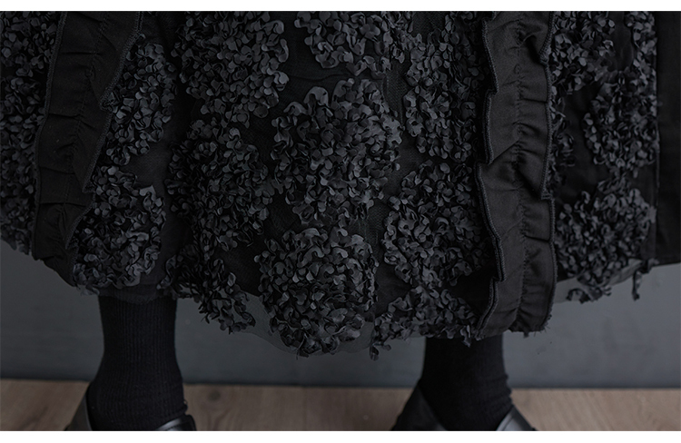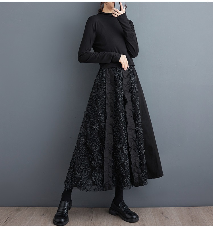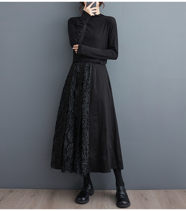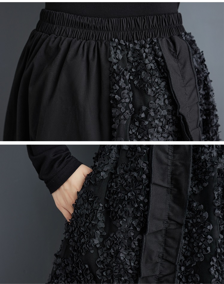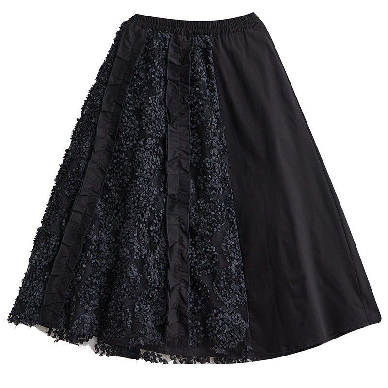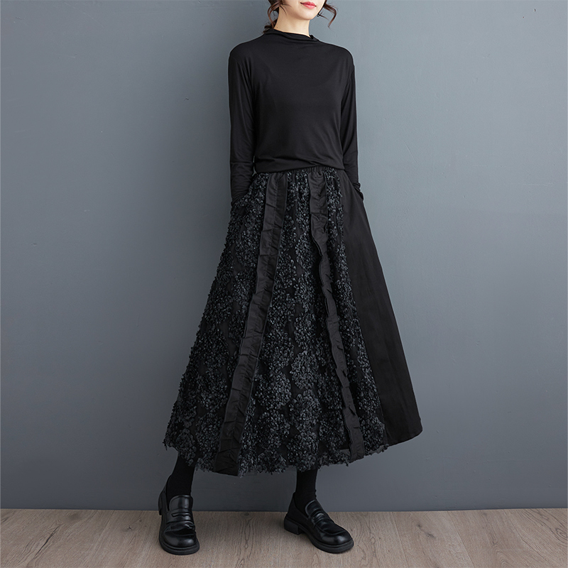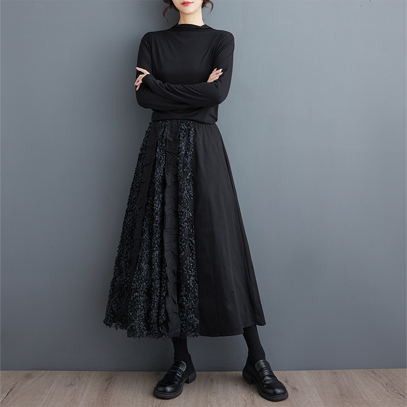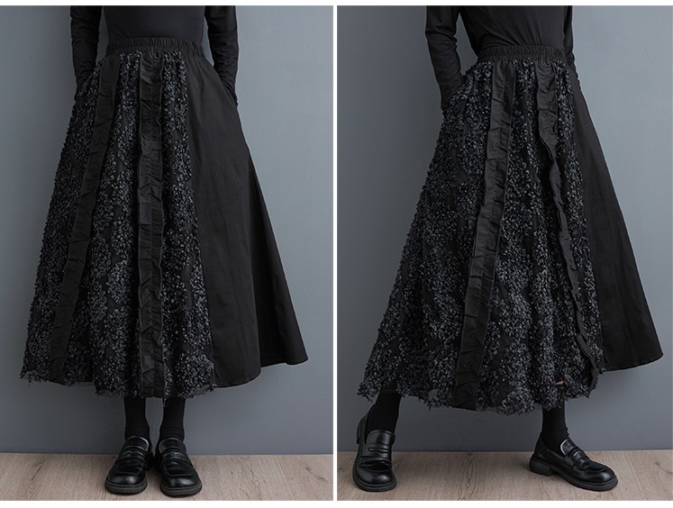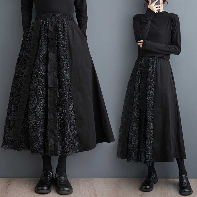 「同梱1万円送料無料」秋新作*レディース*カジュアル*ゆったり大きいサイズ*お花刺繍*切り替え*無地ロングフレアスカート*黒