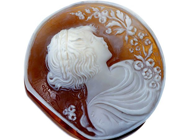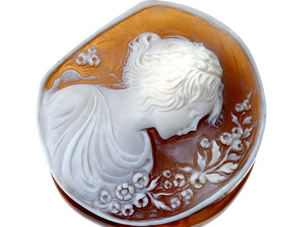 美しい花と髪飾りの女性デザインの彫刻が魅力的なシェルカメオルースを激安価格で特別大放出致します!