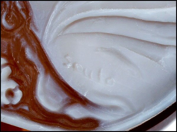 微笑ましい表情を浮かべる女性像は、柔らかい髪の曲線や、艶やかな肌の質感など、精緻を極めた繊細な彫刻で演出された魅力的なシェルカメオルース作品です!