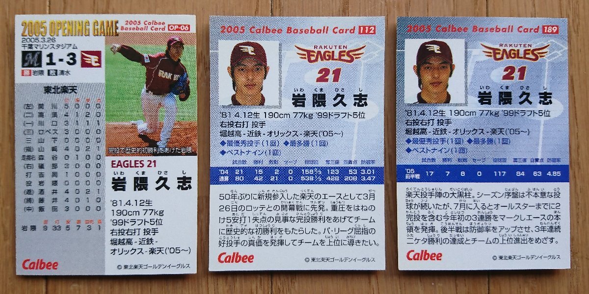 【カード・カルビー2005年】岩隈久志 OP-06 開幕戦 / 112 / 189 計3枚セット 東北楽天ゴールデンイーグルス カルビープロ野球チップス