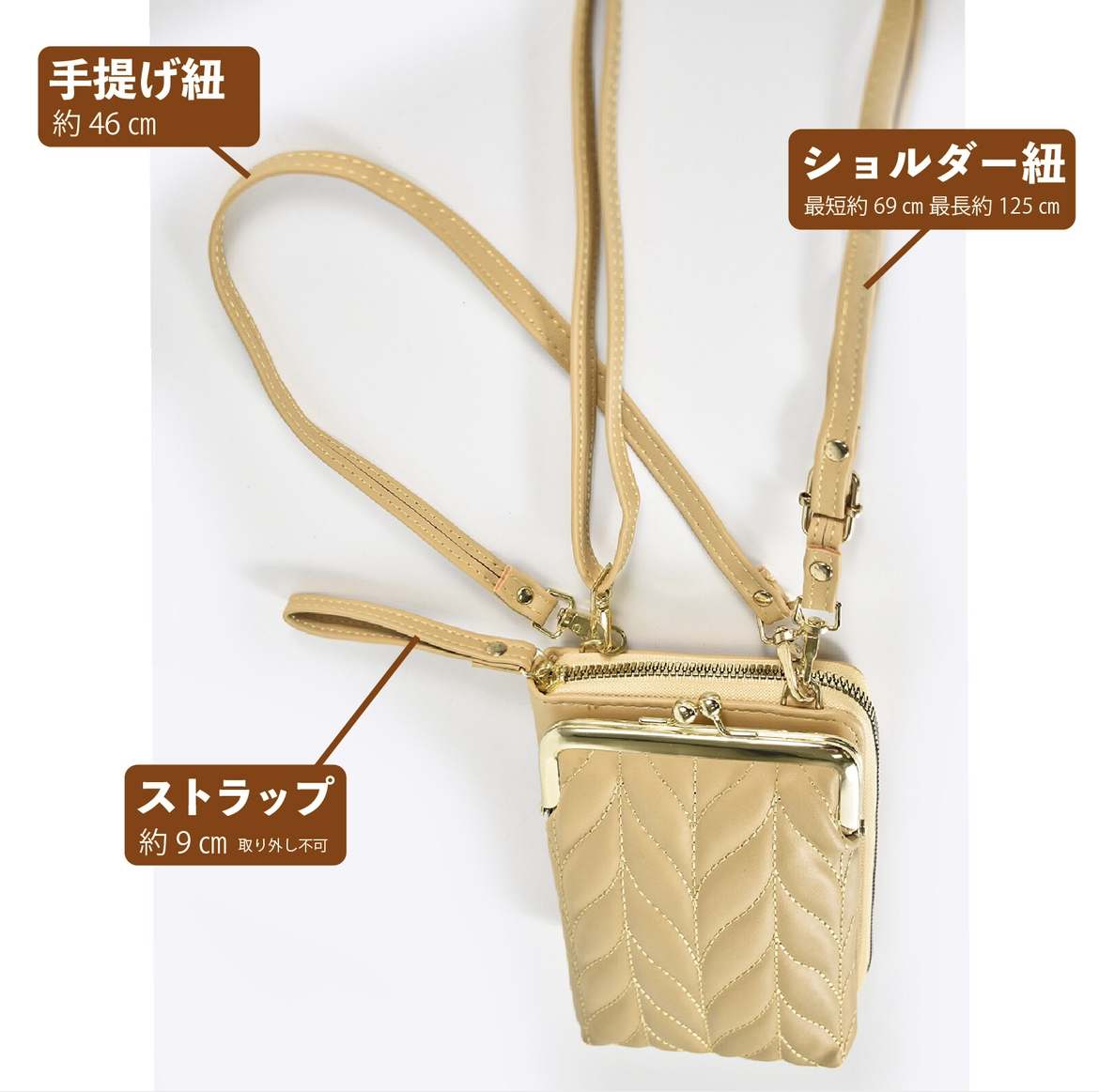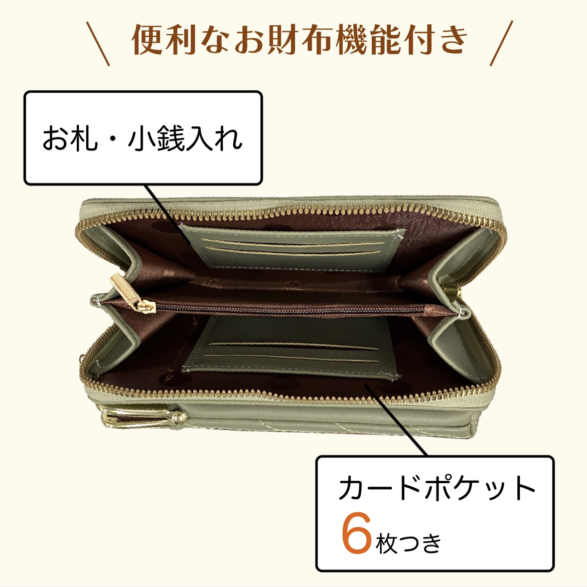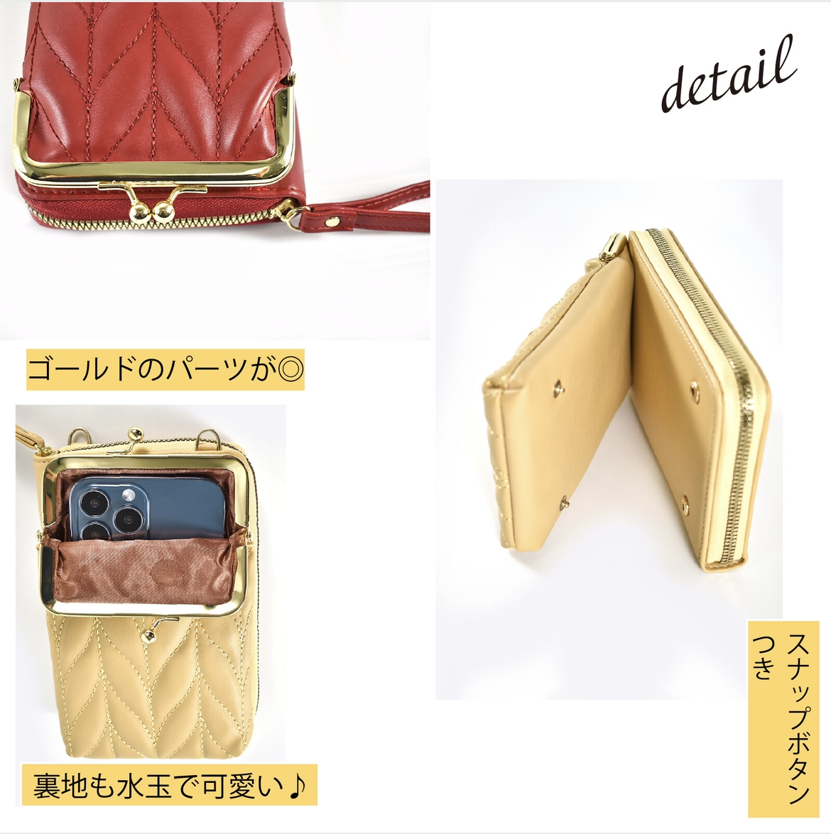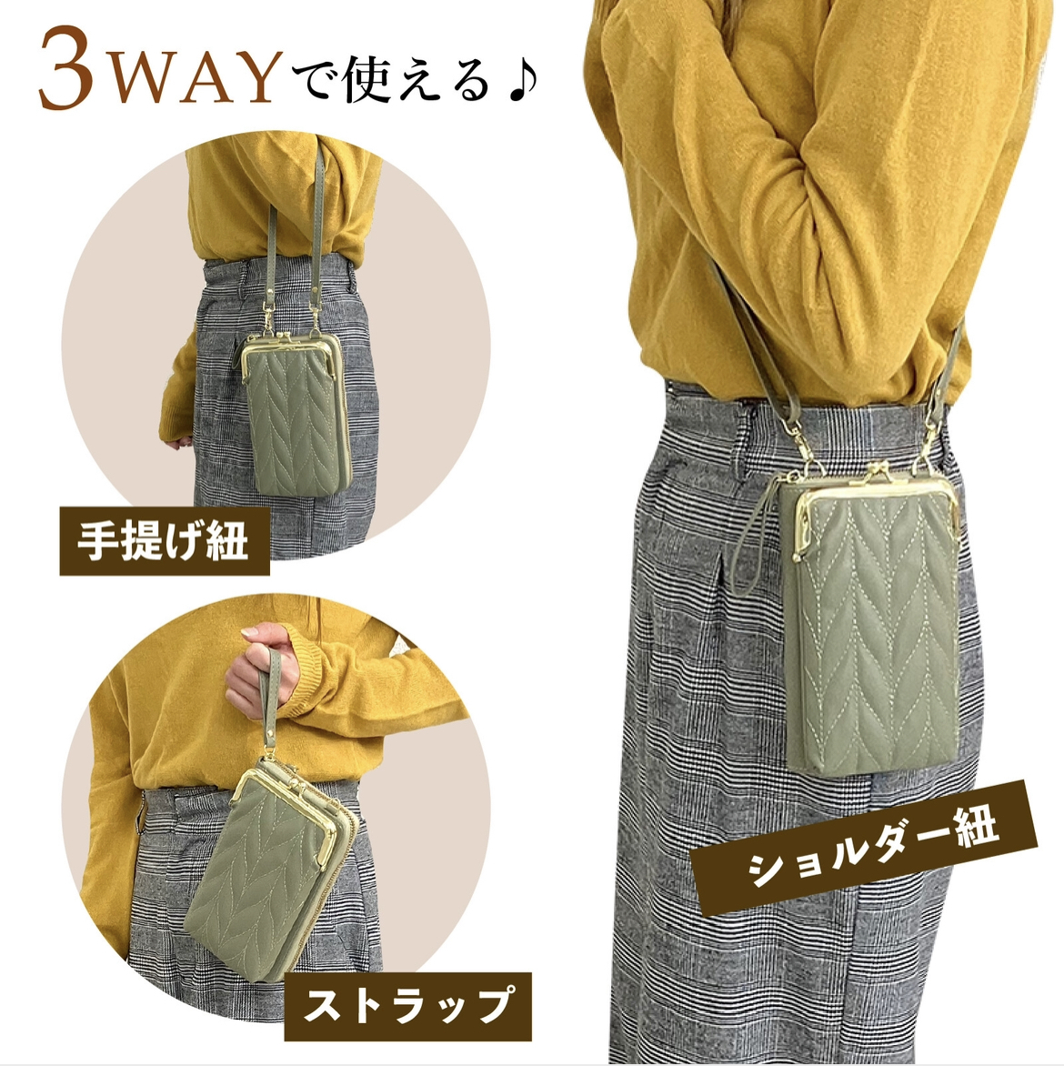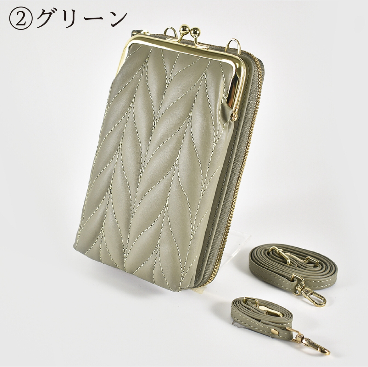 カラー・・・グリーンサイズ(約)・・・縦19cm×横11cm×マチ4 cm仕様・・・がま口ポケット ファスナーポケット 内ファスナーポケット(小銭入れ) 内カード入れ×4 ショルダー紐 手提げ紐素材・・・合成皮革 ◆仕切りやポケットが充実しています!ファスナーがガバッと開いて中が見やすい。◆おでかけはもちろん、通勤・通学のお供に!◆収納スペースも豊富で仕分けや整理がとてもしやすいです。◆ショルダー紐は取り外せるので、お財布として普段使いも可能です。◆スマホや小物が入るため、これひとつでお出かけにも十分!◆ショルダー紐の他に手提げ紐も付いているので、用途で使い分けができます。
