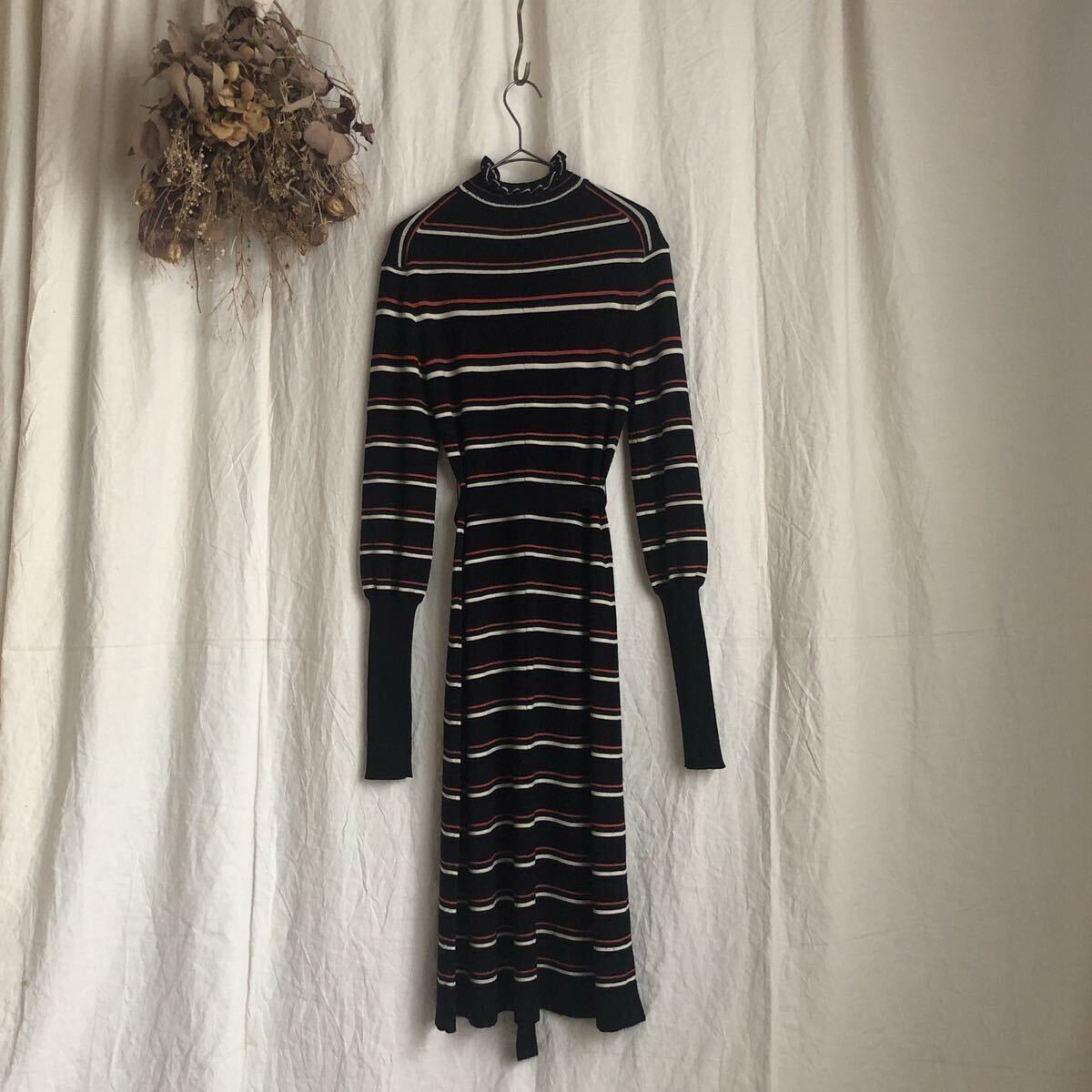 レア Chloe クロエ 2021AW ボーダー 襟フリル ボーダー ニット ロングワンピース/ドレス ベルト付 XS
