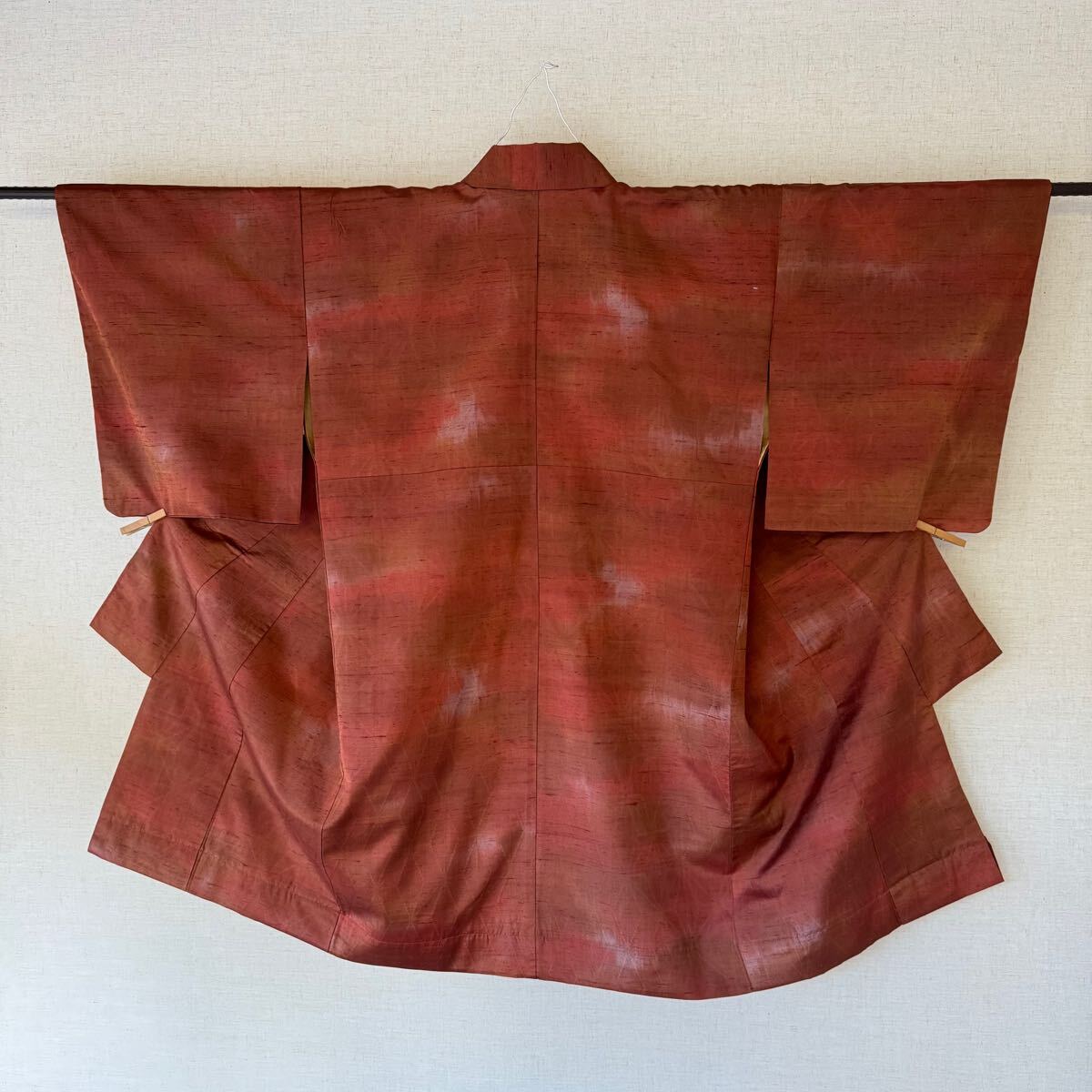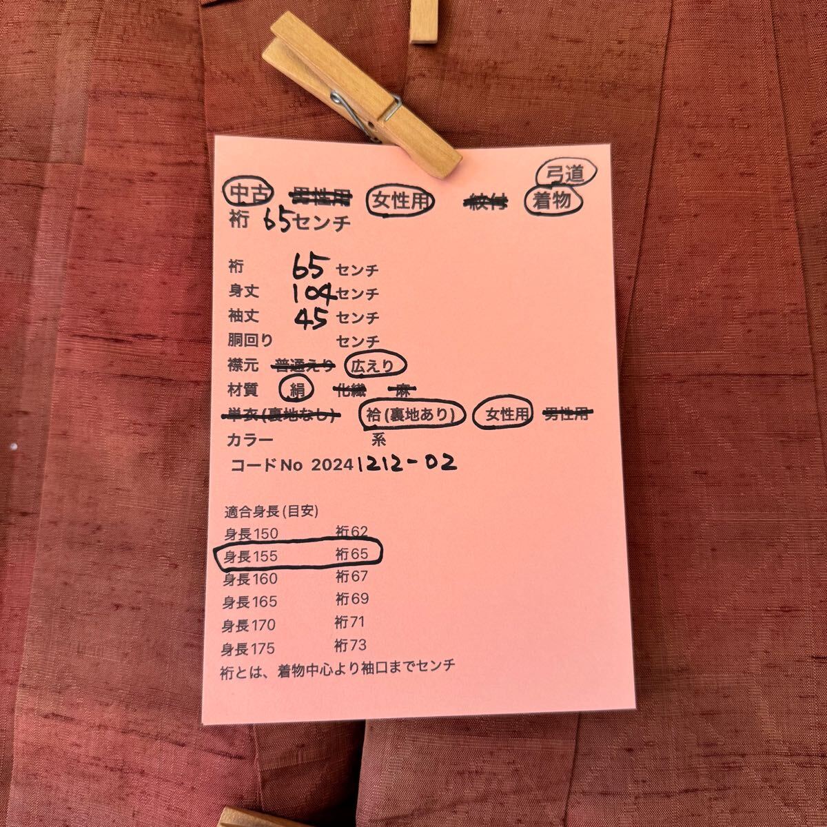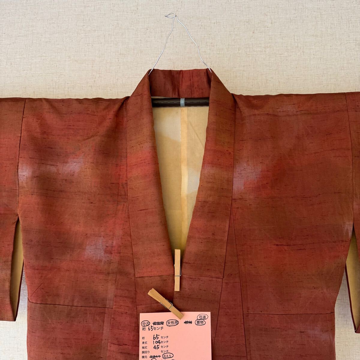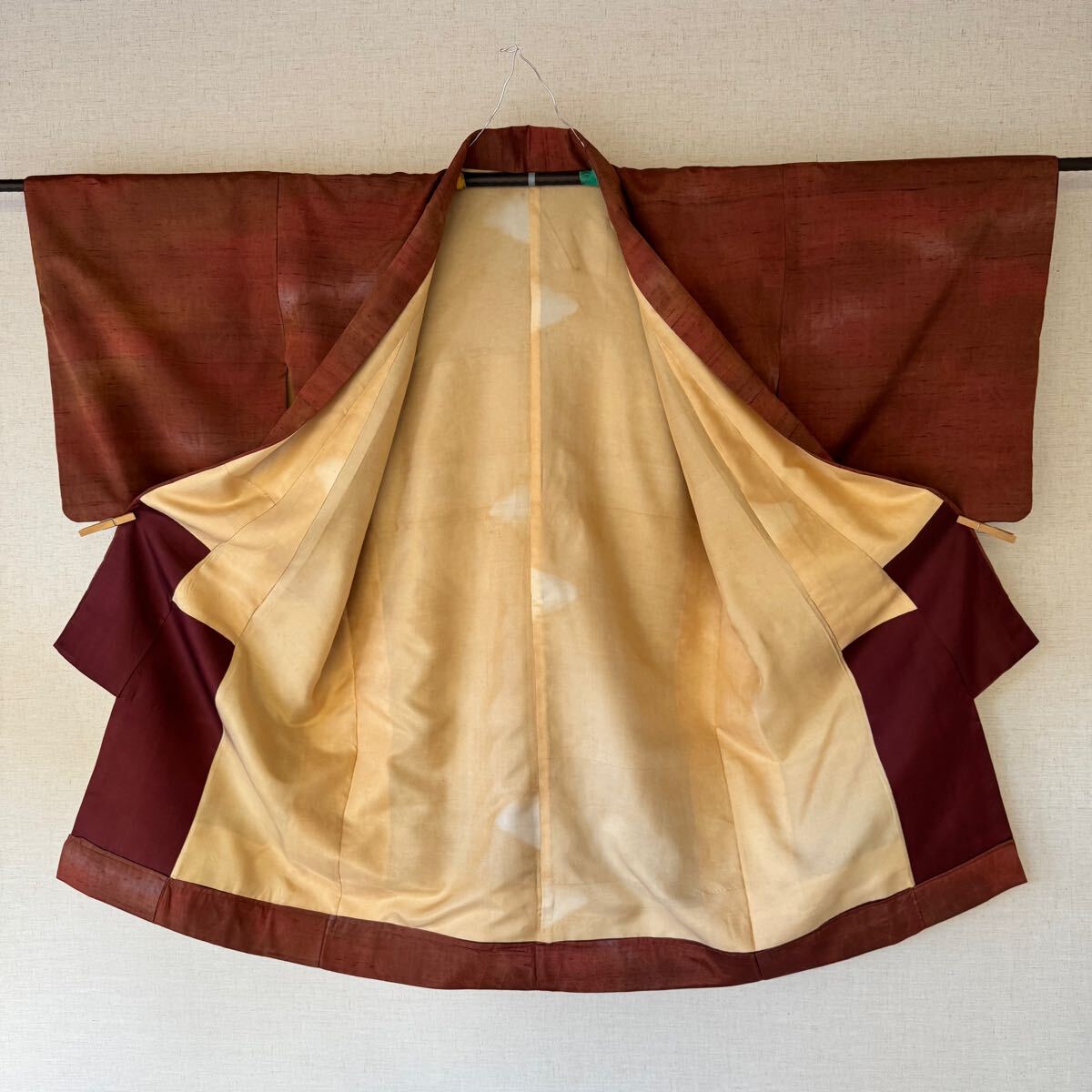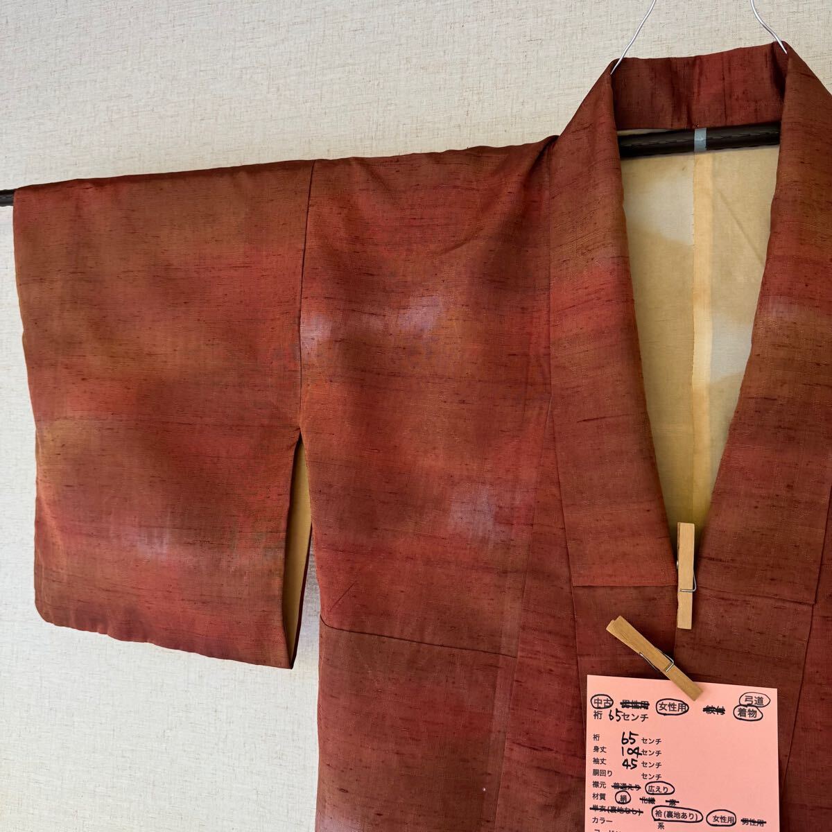 着物古着を弓道用に改造しています。身長155センチ前後の方に適合(目安)。材質は絹 たすき掛け 良好。たすき付、1枚目の写真が1番近い色と思います。裏地に変色があります。