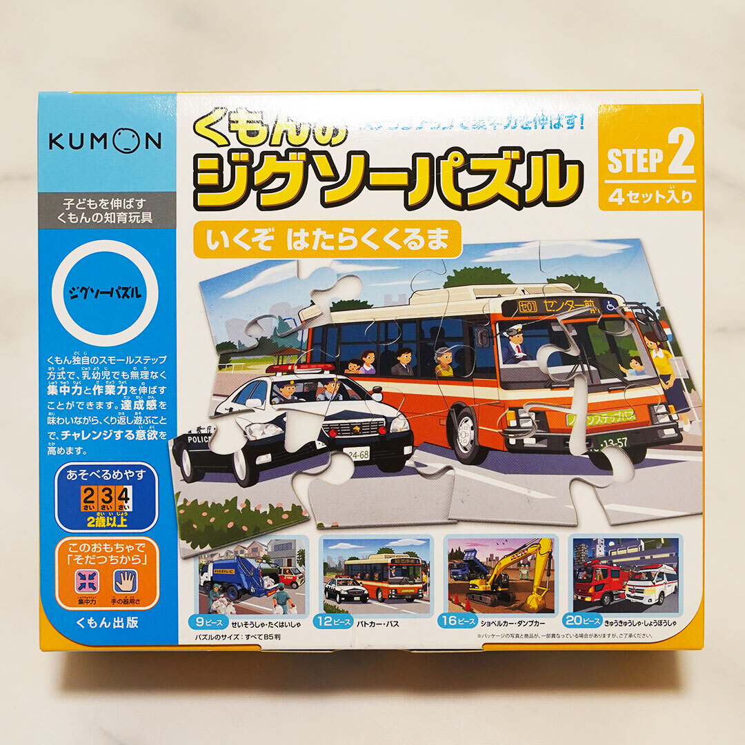 新品☆くもんのジグソーパズル STEP2 いくぞ はたらくくるま 知育玩具 2歳以上 KUMON 清掃車・バス・パトカー・建設機械・消防車・救急車
