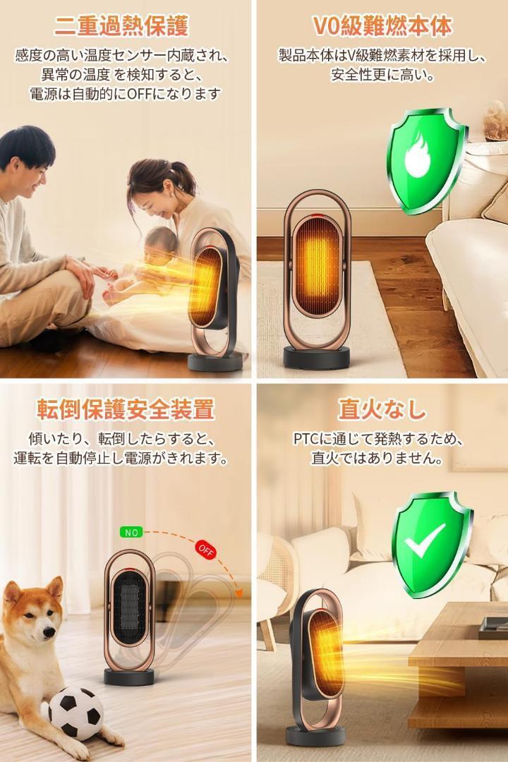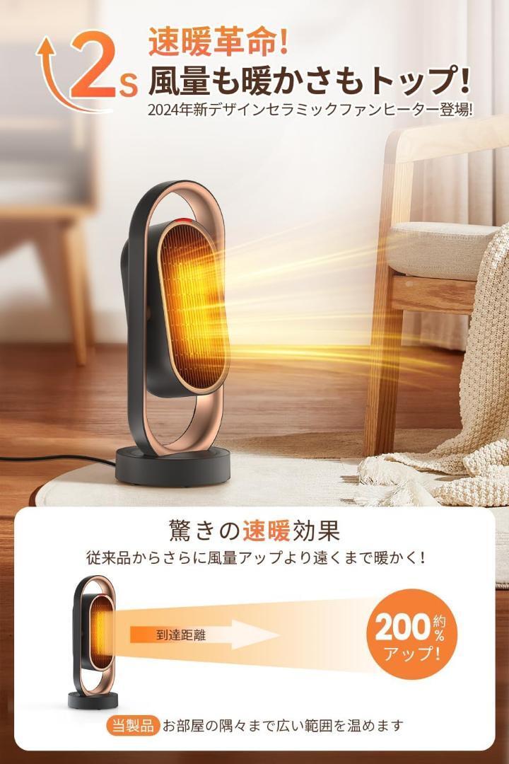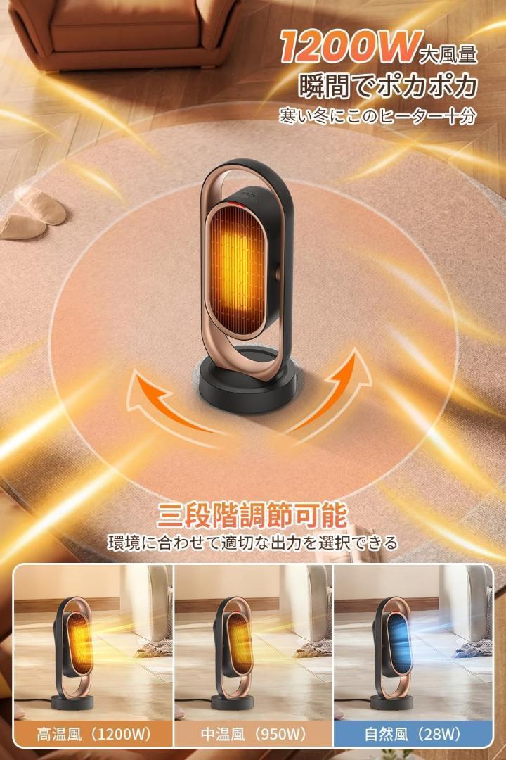 ①当 セラミックファンヒーター は、電熱転化率の高いPTCセラミック発熱体を採用され、最 大出力1200Wのハイパワーで従来品に比べては圧倒的な大風量。暖かくまでのヒヤヒヤ時間はもうさようなら。2秒でぽかぽか、立ち上がりを待たずに暖まることができます。②電気ヒーターは自然風、中温風、高温風と3段階モードが切り替え出来、ニーズによりお好みの風量と温度を選択できます。電気式ヒーターなので、ガスや灯油などの燃料を使用しなく、石油ストーブを使用するときのにおいがしません。面倒な工事、給油や換気はしなくて済みます。火を使わない無臭のセラミックヒーターです。