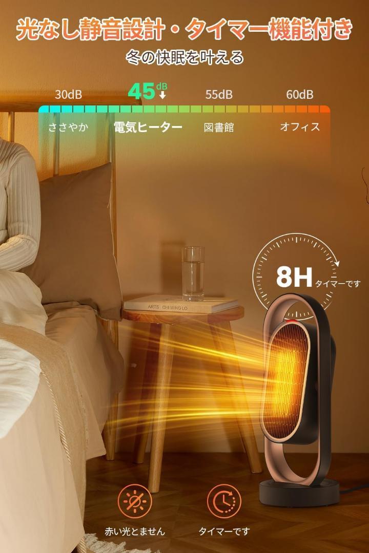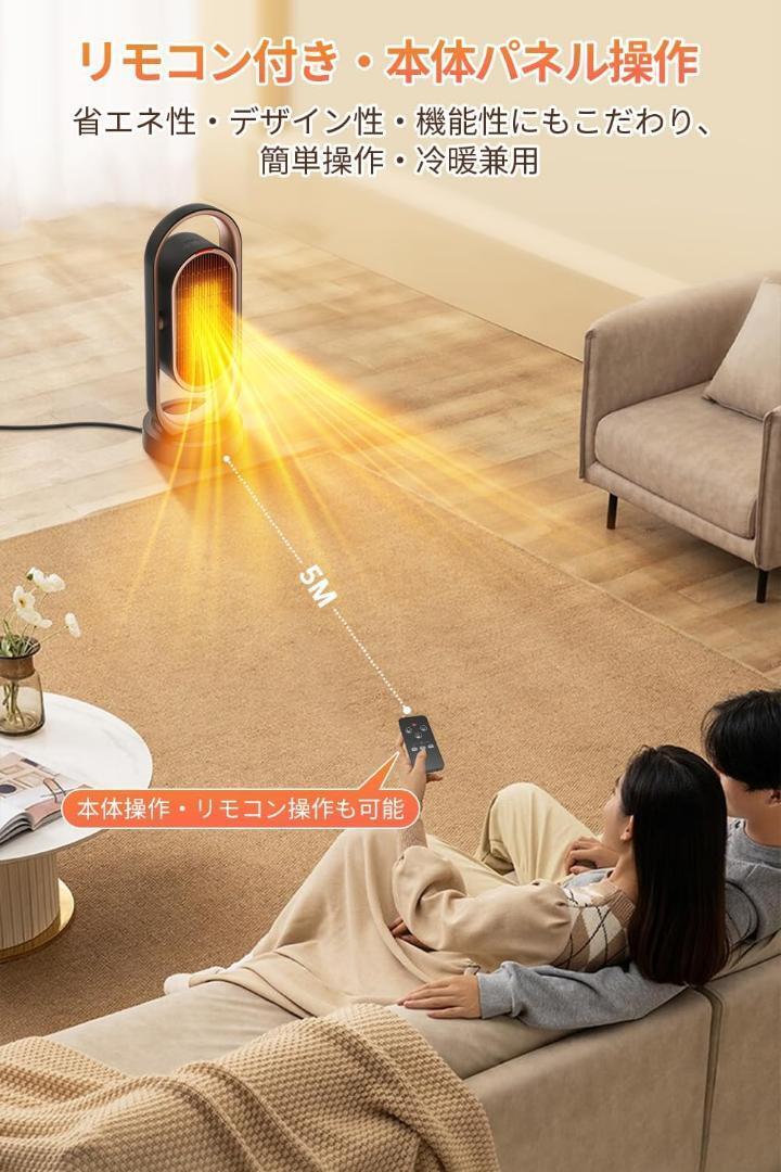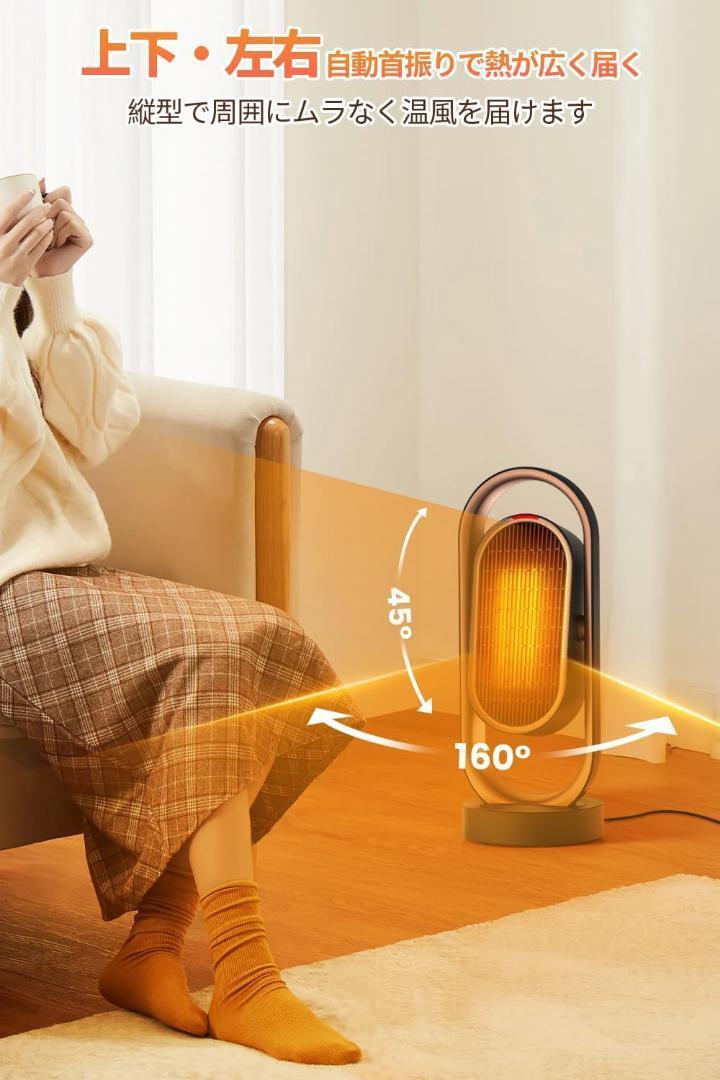 ヒーター 上下は45度まで調整可能、頭から足元までしっかり速暖。左80度右80度の合計160度のワイドな首振で本体を移動させずに広範囲をしっかり暖めてくれます。また同時に3D首振りが可能。可動範囲が広いので、暖かい空気が広がり、より広い場所へ送風するこが可能です。暖房(エアコン)の使用に合わせて、お部屋全体の温度を上がるスピードはもっと早いです。夏用では、低消費電力なのでかなり省エネ、扇風機&サーキュレーターとしてお部屋の空気循環にも役に立つことができて一石二鳥です。かつ、前回使用時の運転モードと首振りを記憶する機能が搭載され、また使用するときには再設置する必要なくなります。電気の無駄がなく、省エネ。環境にも財布にも優しいセラミックヒーターです。