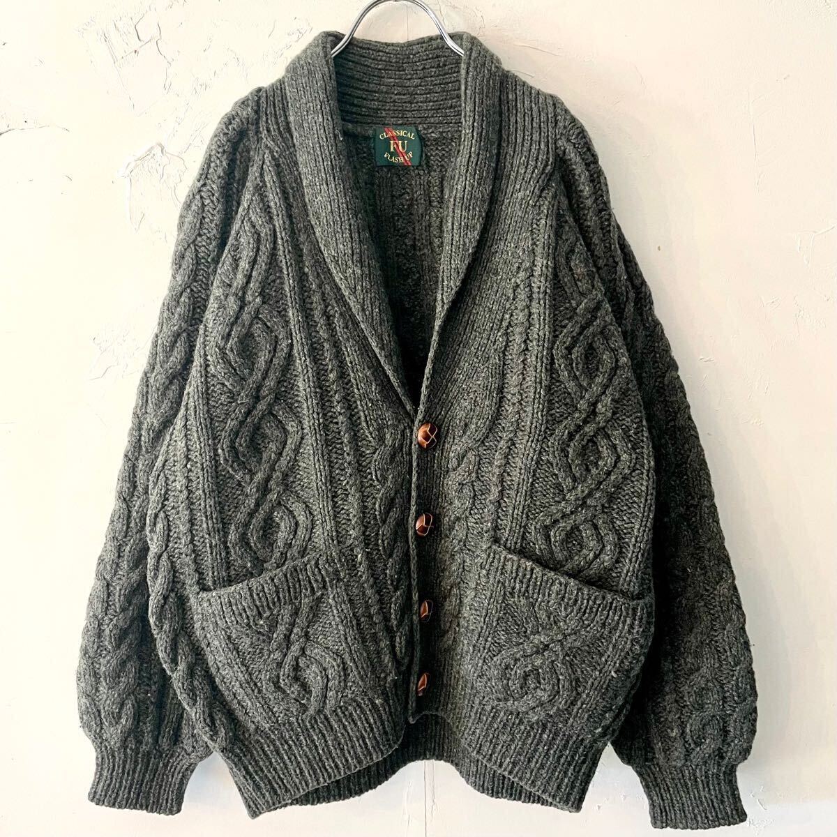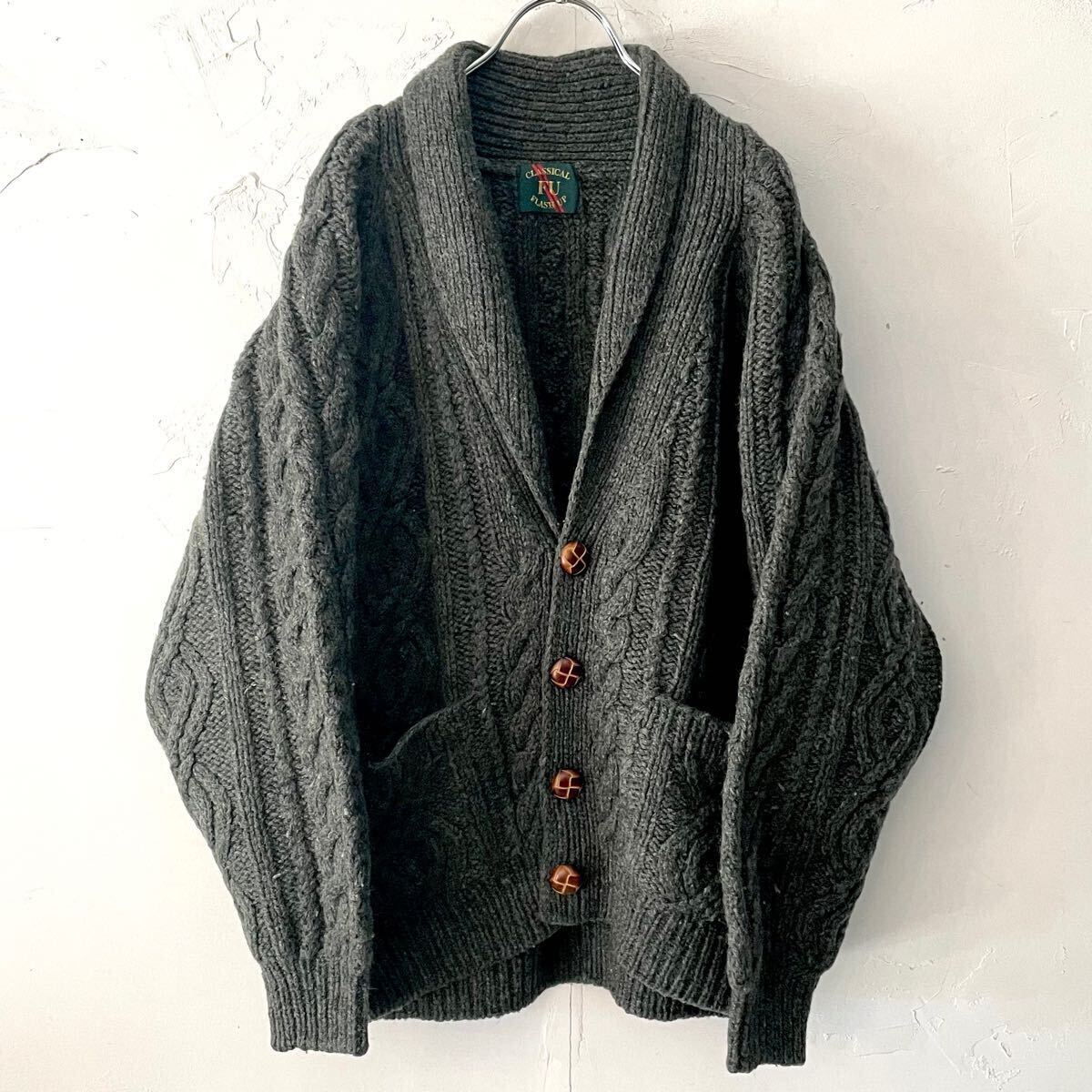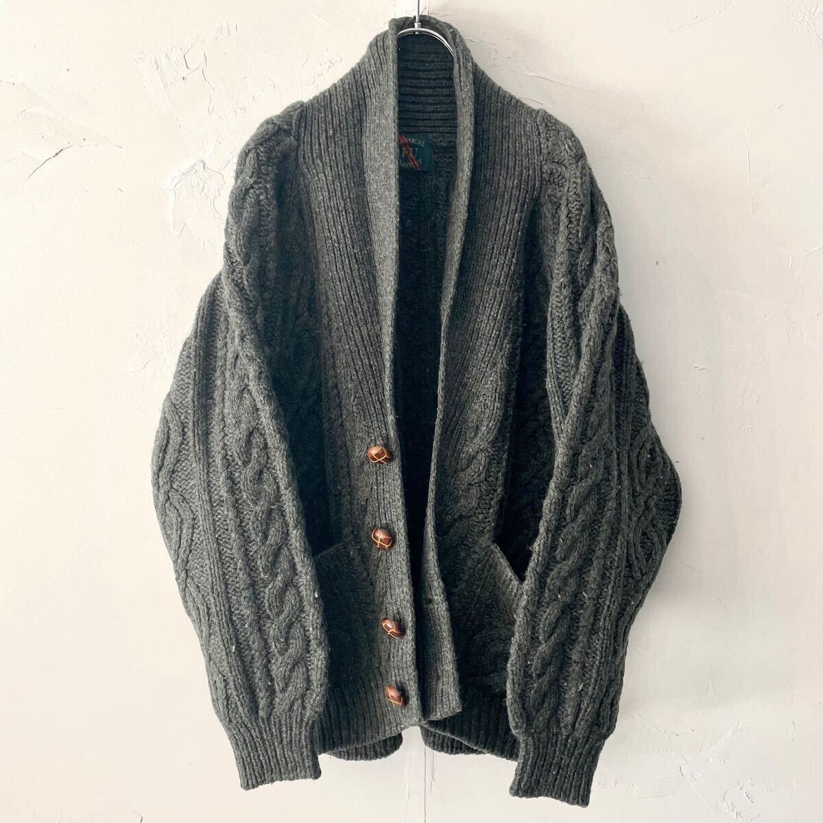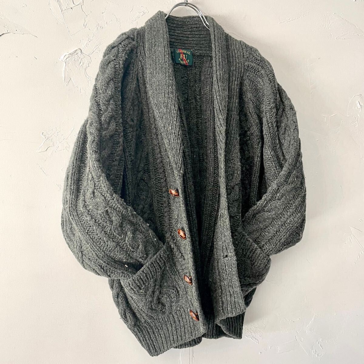 ヴィンテージ ケーブル編み フィッシャーマン ニットカーディガン NEW WOOL 100% ラグラン 肉厚ニット グレー くるみボタン メンズ古着になります。