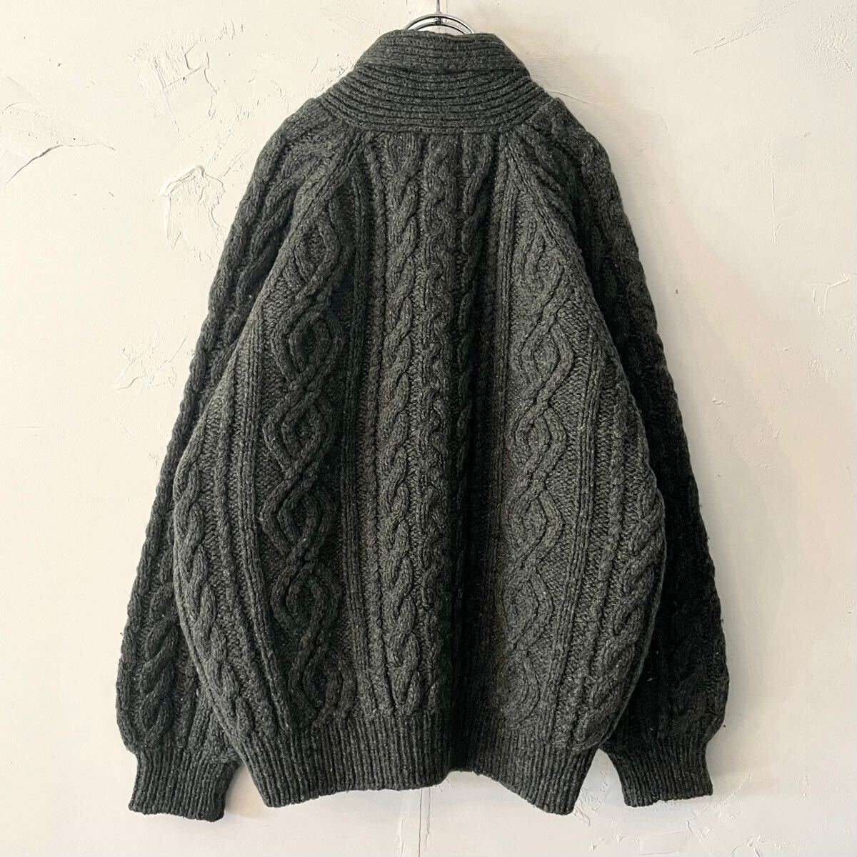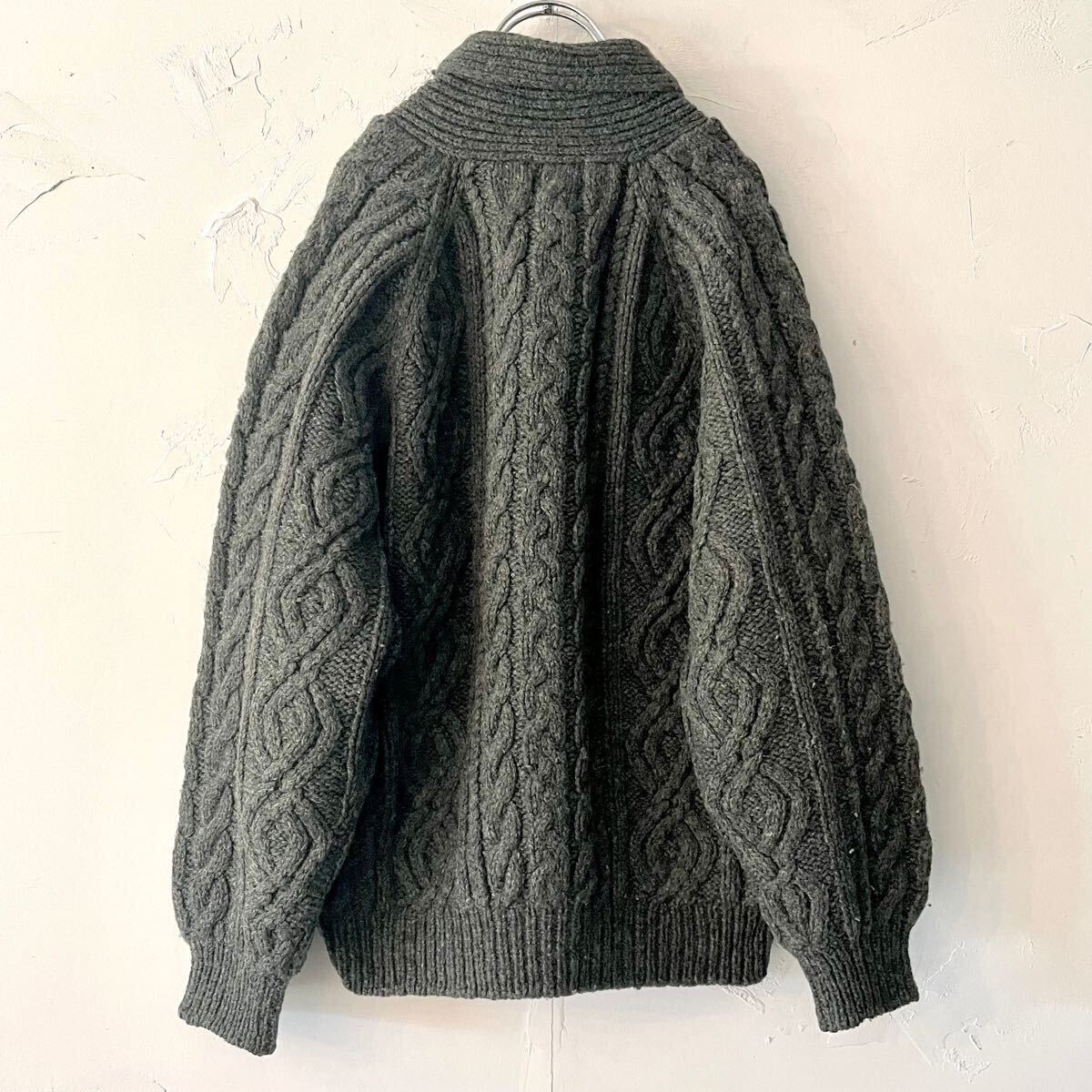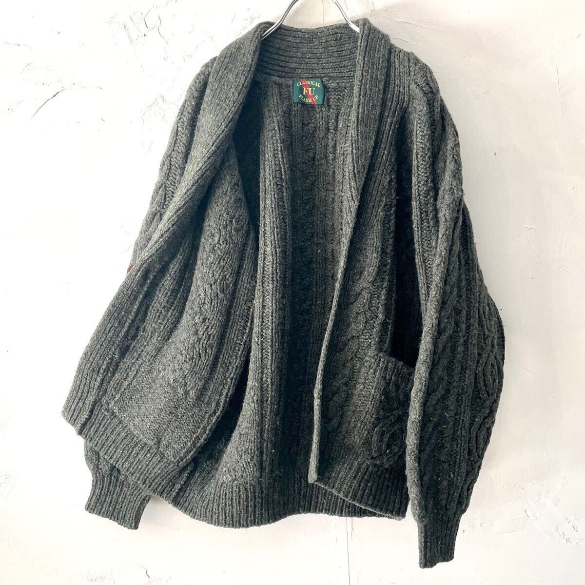 NEW WOOL 100% 肉厚 ケーブル編みフィッシャーマン ニットカーディガン サイズM~Lぐらい。グレー系。ラグランスリーブで肩のおちるサイズ感フォルムの良い品です。ややオーバーサイズで男女問わずざっくりと着て頂けるかと思います。