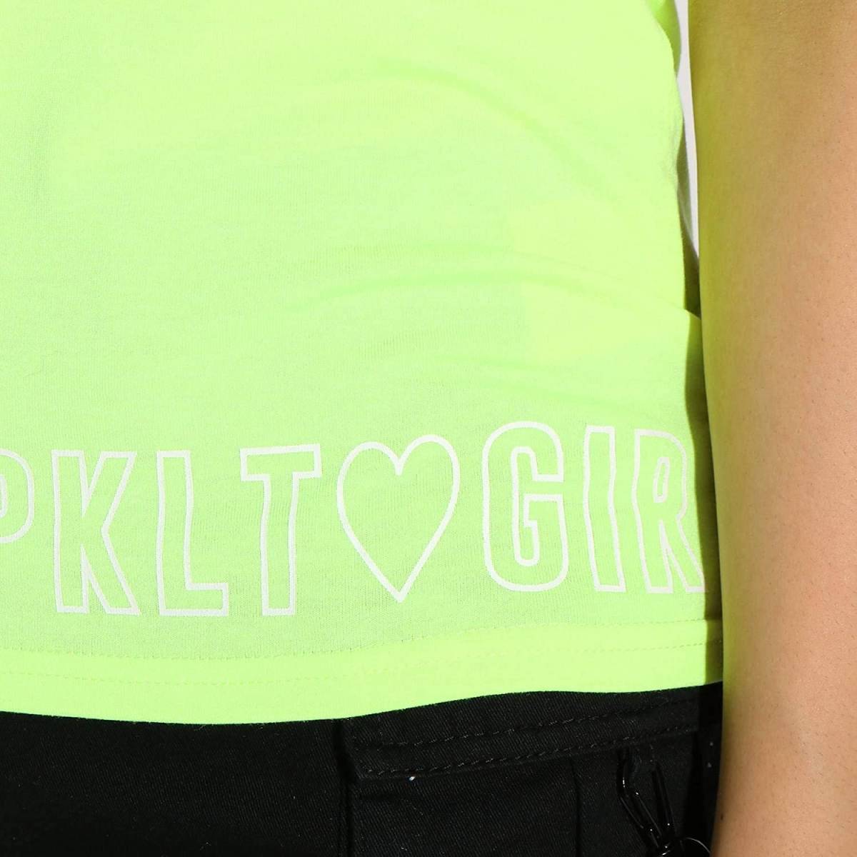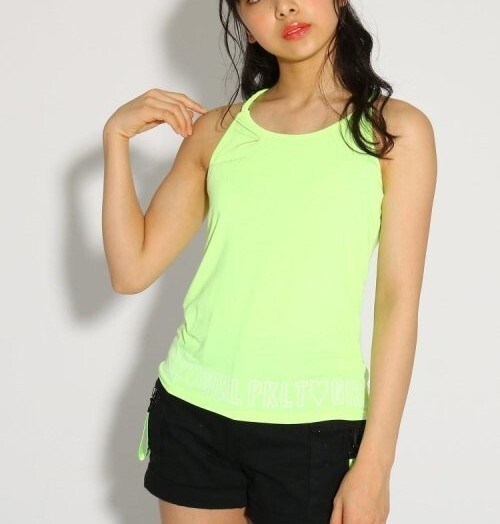 ショッキングカラーとクロスバックのストラップが夏らしさを演出するキャミソール。