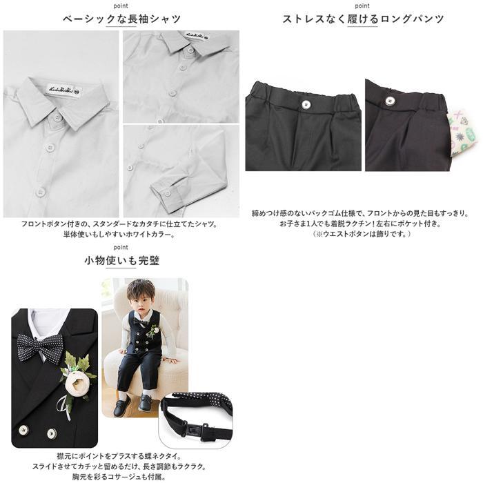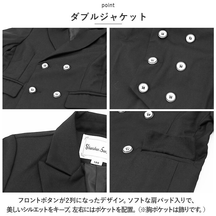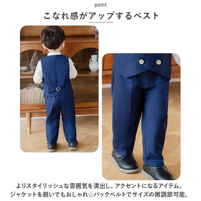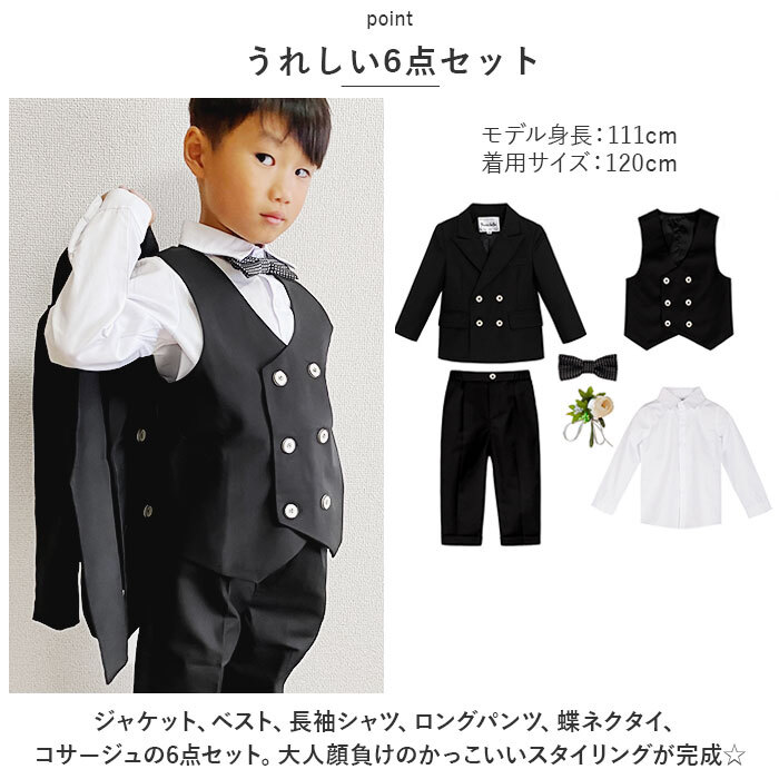 | 商品説明 | ・・コーデに悩むことなく、おしゃれにキマる!キッズ用(男の子)フォーマル6点セットが新登場。 ・【うれしい6点セット】 ・ジャケット、ベスト、長袖シャツ、ロングパンツ、蝶ネクタイ、コサージュの6点セット。大人顔負けのかっこいいスタイリングが完成☆ ・【ダブルジャケット】 ・フロントボタンが2列になったデザイン。ソフトな肩パッド入りで、美しいシルエットをキープ。左右にはポケットを配置。(※胸ポケットは飾りです。) ・【こなれ感がアップするベスト】 ・よりスタイリッシュな雰囲気を演出し、アクセントになるアイテム。ジャケットを脱いでもおしゃれ☆バックベルトでサイズの微調節可能。 ・【ベーシックな長袖シャツ】 ・フロントボタン付きの、スタンダードなカタチに仕立てたシャツ。単体使いもしやすいホワイトカラー。 ・【ストレスなく履けるロングパンツ】 ・締めつけ感のないバックゴム仕様で、フロントからの見た目もすっきり。お子さま1人でも着脱ラクチン!左右にポケット付き。(※ウエストボタンは飾りです。) ・【小物使いも完璧】 ・襟元にポイントをプラスする蝶ネクタイ。スライドさせてカチッと留めるだけ、長さ調節もラクラク。胸元を彩るコサージュも付属。 ・【色々なシーンで活躍】 ・お子さまが着用しやすい、薄手の柔らかな生地感。誕生日や七五三、結婚式などのイベント、入学・卒業式に! |