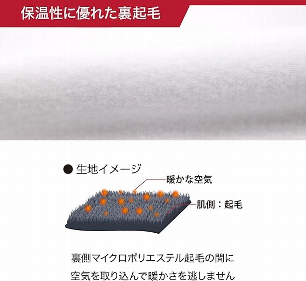 ●裏側部分に空気を取り込み暖かさを逃さないマイクロポリエステル起毛を使用しているため、薄手でも保温性に優れ暖かい素材です。