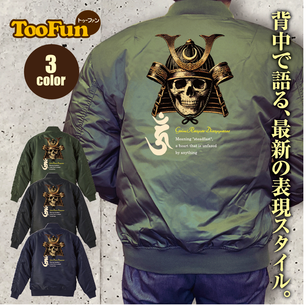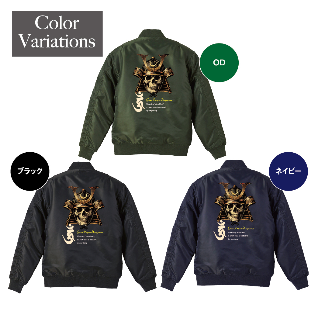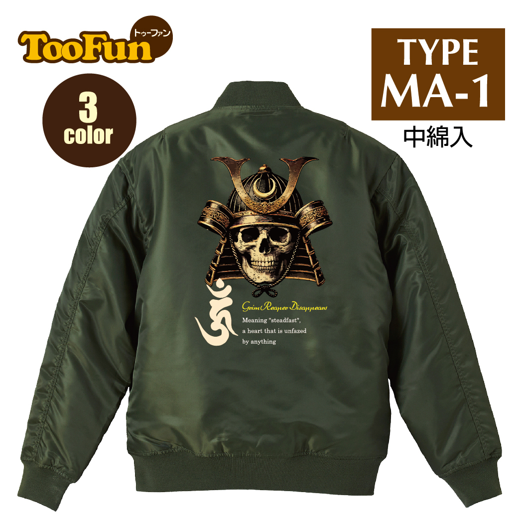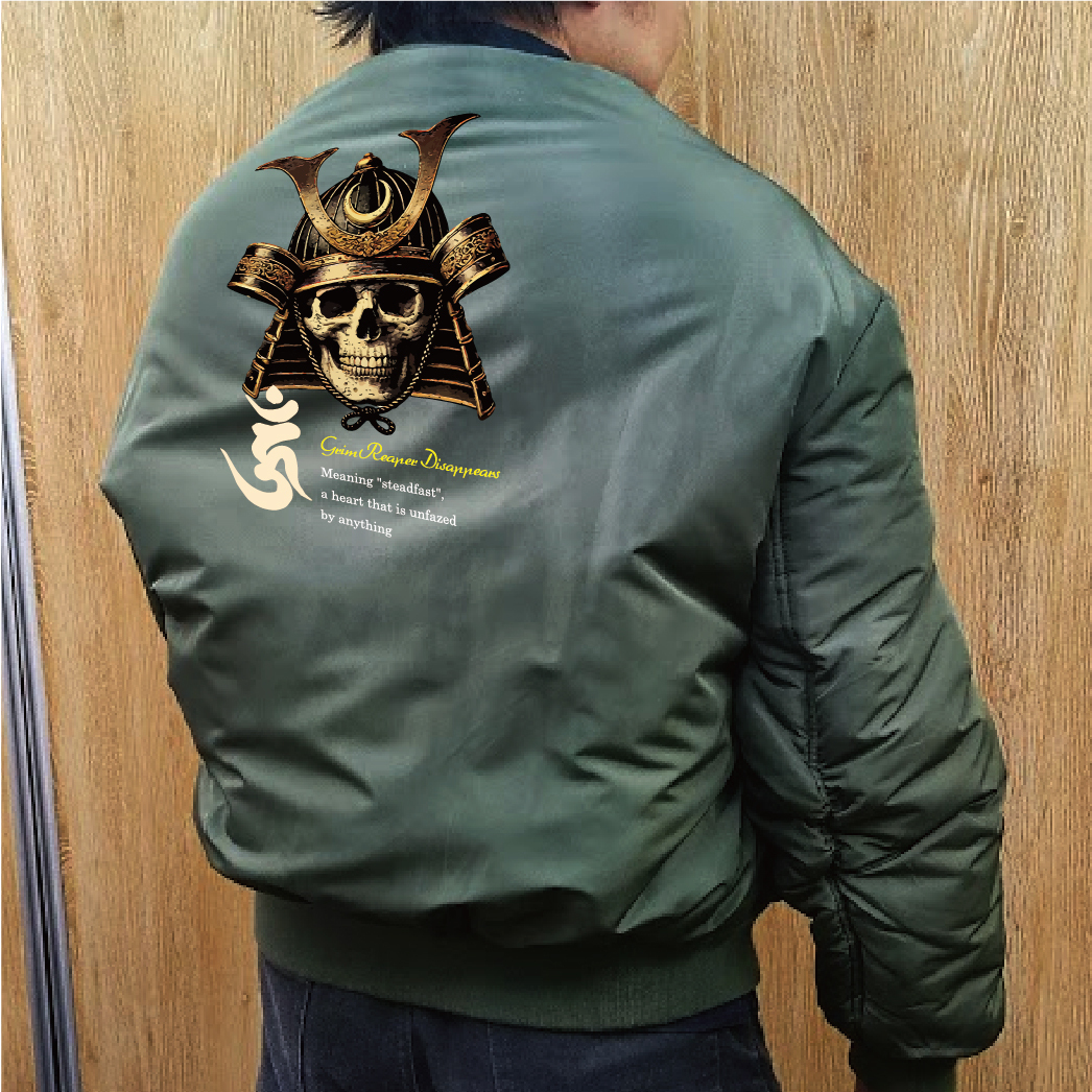 タイプ MA1フライトジャケットは、秋冬のカジュアルスタイルにぴったりのユニセックスアウターです。ミリタリー風のデザインに、戦国武将の兜やドクロ、梵字がバックプリントされ、個性的な表現を楽しめます。悪霊退散の意味を込めたオリジナルデザインが特徴で、全3色から選べるので、さまざまなコーディネートに合わせやすい一着です。※画像はイメージとなり、実際とは多少異なりますので予めご了承ください。※実際にお持ちのジャケットとサイズ表をよくご確認の上ご購入ください。※受注生産となるため、返品、交換はご遠慮ください。※料金は1枚での価格となっております。