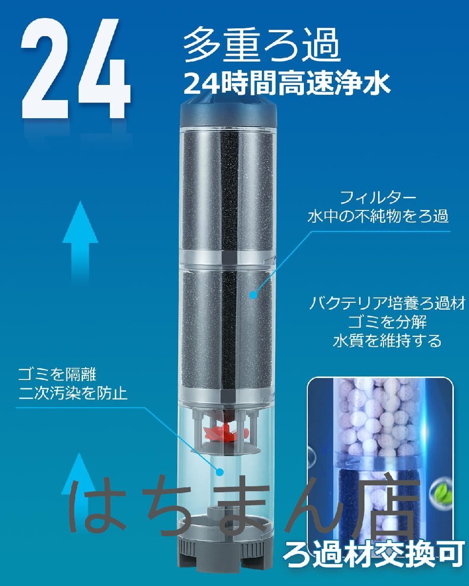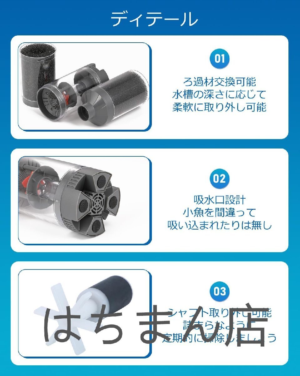 【使いやすい】吸水口には小魚が吸い込まれないように、付属するろ過保護網が取付けできます。また、取り外し可能な構造なため、シャフトは定期的に掃除でき、詰まりを防ぐこともできます。*ポンプは水面下3㎝に設置することが必要です。ご購入する際に、お持ちの水槽サイズ・水量・生体の数に合わせてフィルターポンプのサイズを選択しましょう。店舗をご確認ください:はちまん店、他の同デザインは全て海賊版でございます、品質は保証されていません、慎重に購入してください。