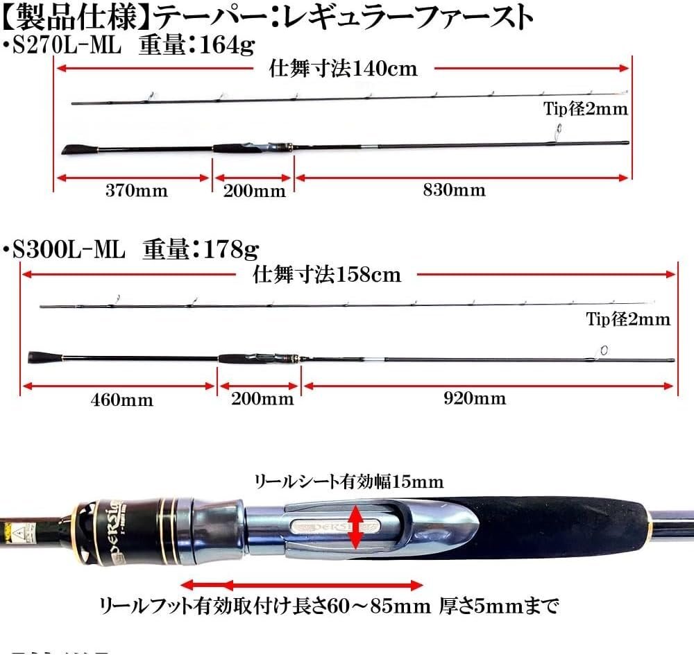 適合ルアーウエイトはS270L-MLが3-12gですが 最大30g(鉛8号)まではキャスト可能 S300L-MLが10-30gですが45g(鉛12号)まで可能でした。