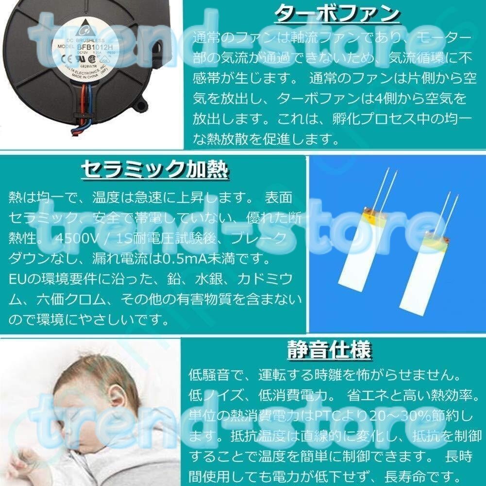 【セラミック加熱シート&冷却ファン】:孵卵機はより信頼性の高いセラミック加熱シートを採用し、高密度があり、急速加熱ができ、優れた断熱性能と熱均一性を持っています。冷却ファンは低騒音で、インキュベーター内の均一な放熱を促進するのに役立ちます。