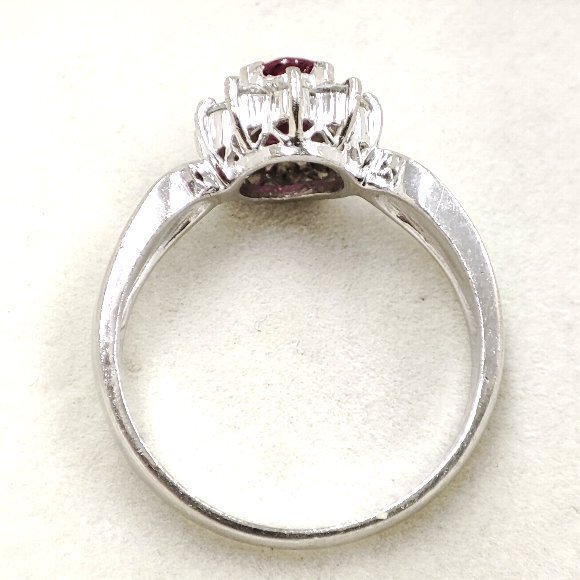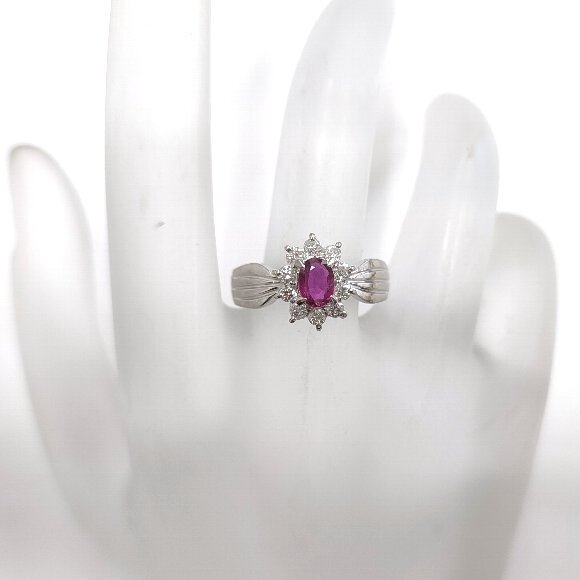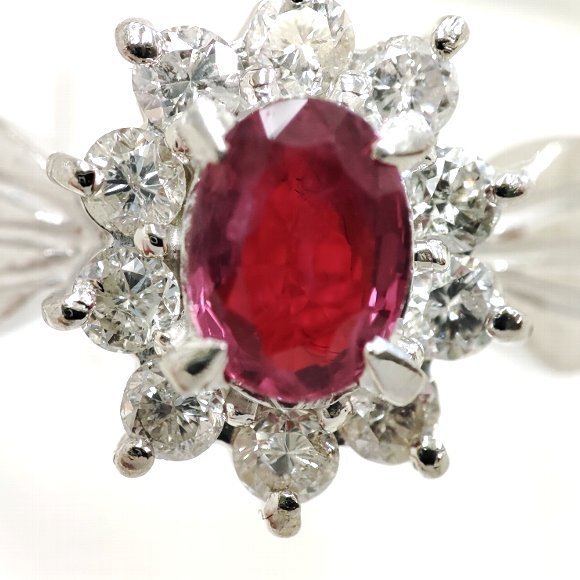 オーバルミックスカット 0.46カラットの天然ルビーをセンターにセットし 合計 10ピース 0.31カラットのラウンドカットのメレダイヤモンドを一重に取り巻いた定番デザインのリングです。ルビーは、バイオレットカラーの入ったやや濃いめの赤色で透明感は有り綺麗です。ルーペで見ましても目立つダメージは ございません。素材は、プラチナ900です。ダイヤモンドのクラリティは主観になりますが、 SIクラスからIクラスになるかと思います。輝きはまずまずです。 |