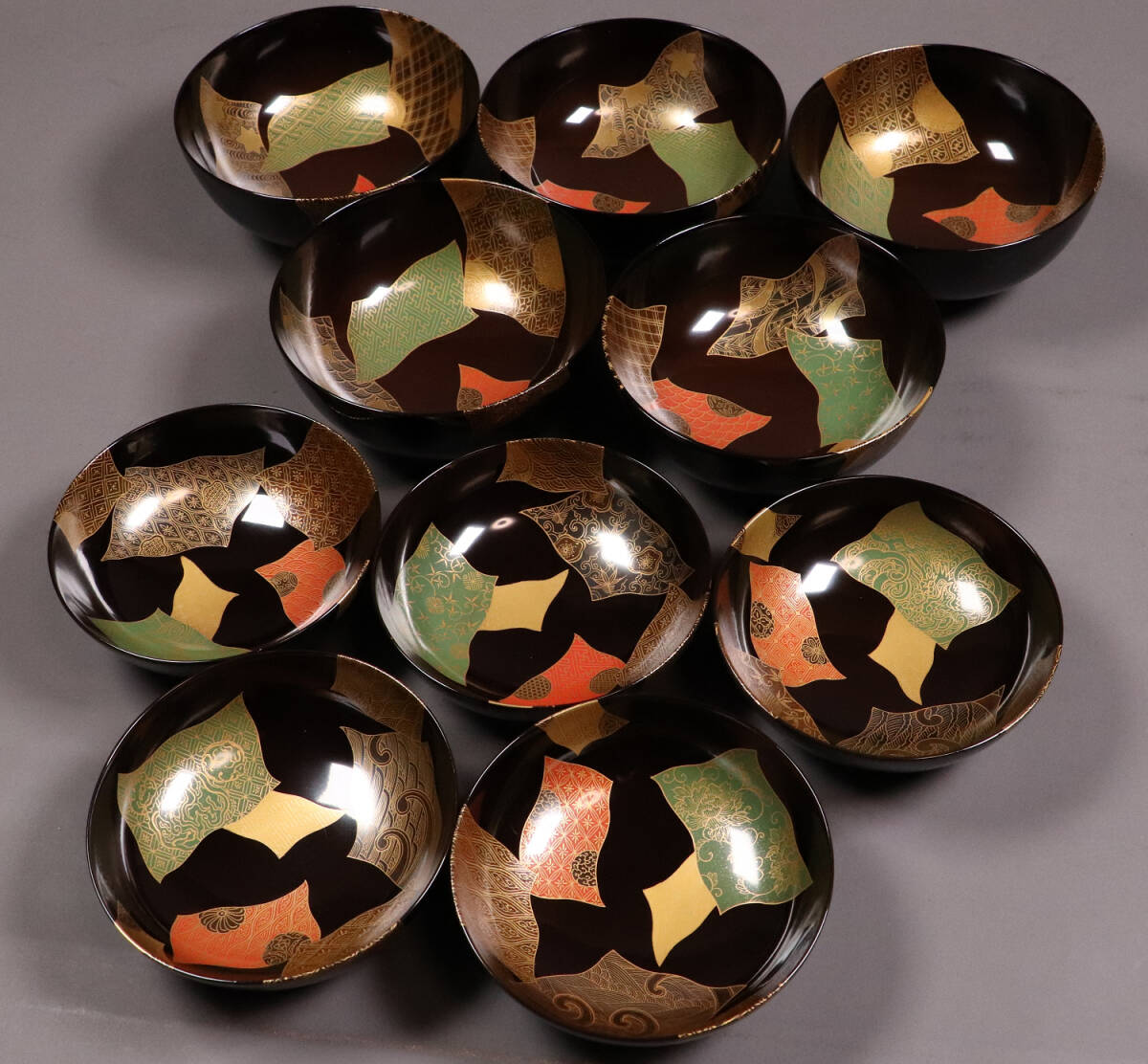 ◇天然木漆塗 小紋伝統柄 蒔絵椀 五客 木箱入 黒塗 木製漆器 漆芸 茶懐石 会席 汁椀【CL65】◇