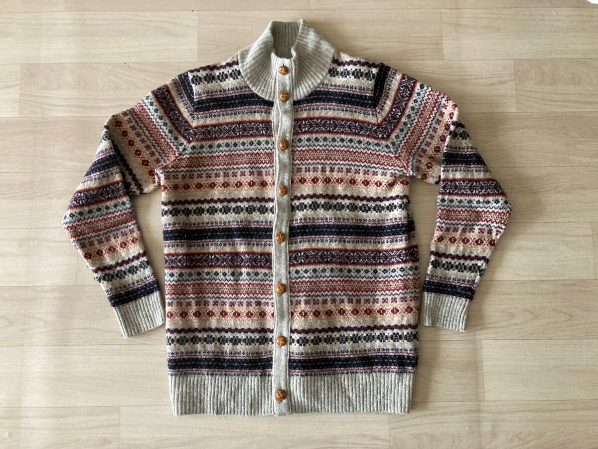 ユニクロ ウール混紡のフェアアイル柄カーディガン、木製ボタン付きでスタイリッシュ。