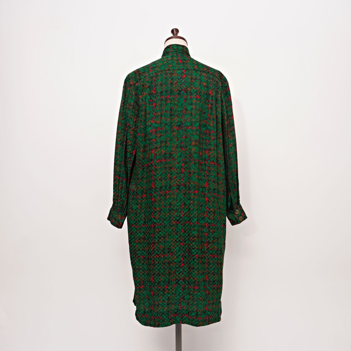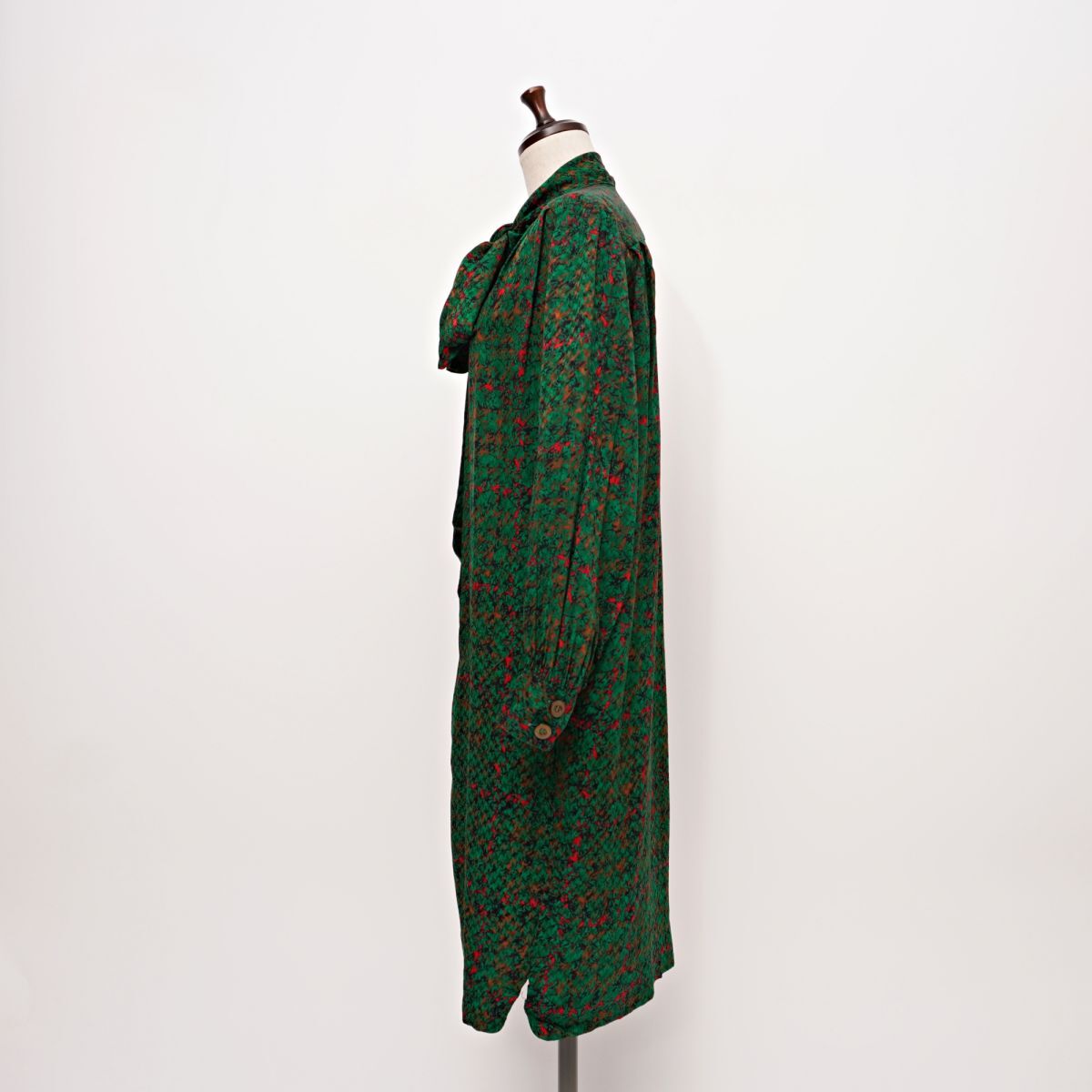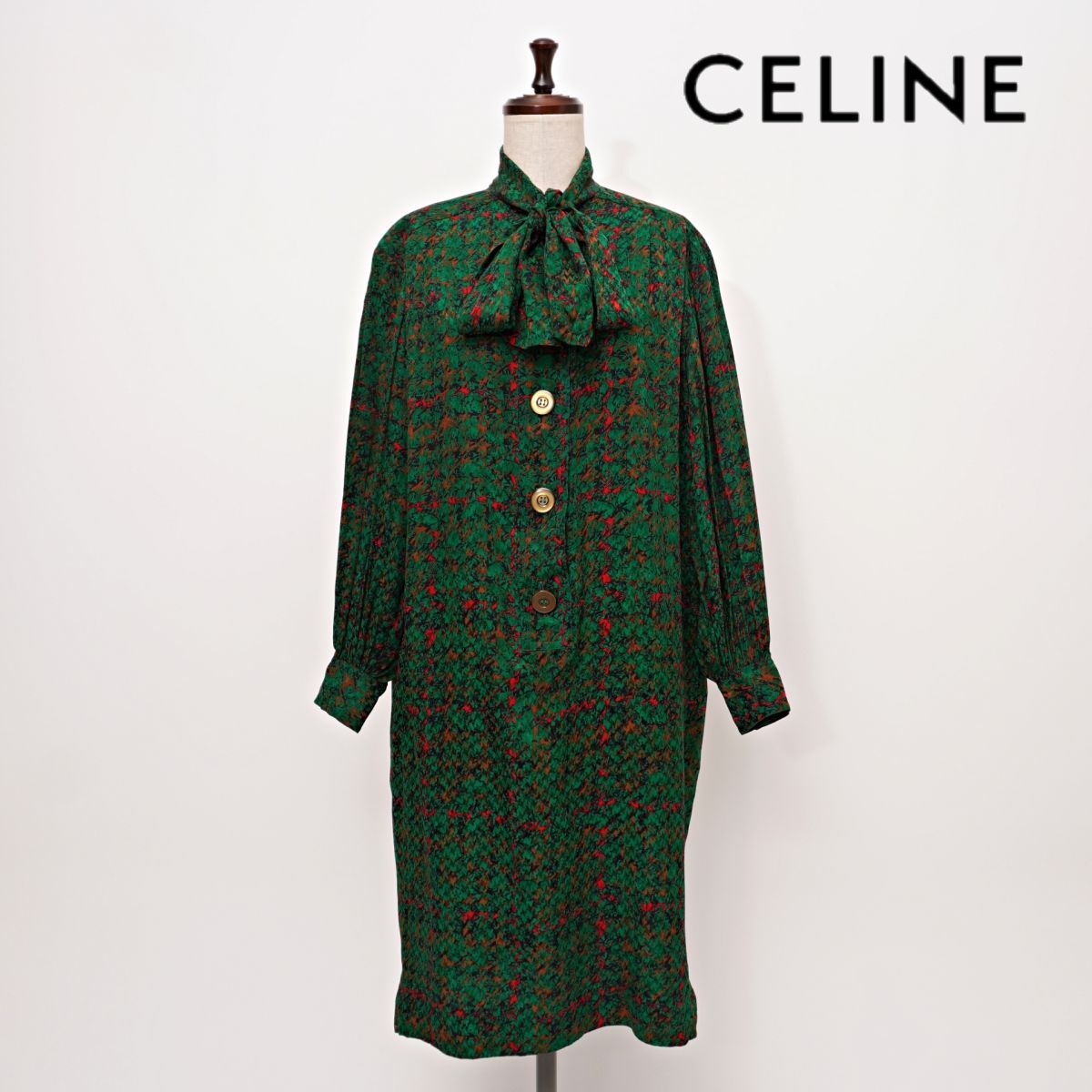 CELINE セリーヌ 80s ~90s 総柄ドレスシャツワンピース ボウタイ付 長袖 薄手 フランス製 オールドセリーヌ グリーン 緑 サイズS相当*XC734