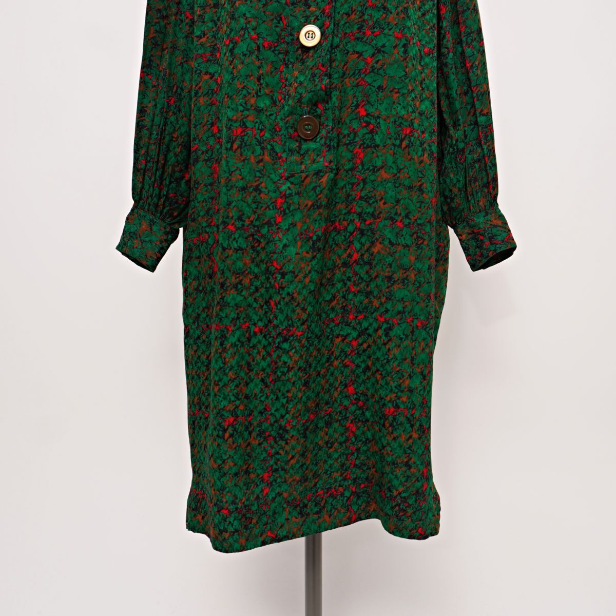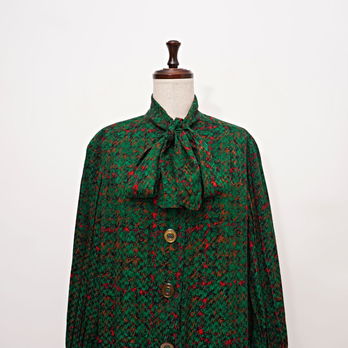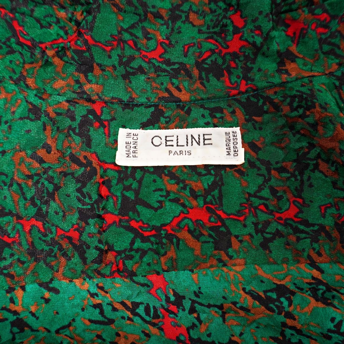 CELINE セリーヌ 80s ~90s 総柄ドレスシャツワンピース ボウタイ付 長袖 薄手 フランス製 オールドセリーヌ グリーン 緑 サイズS相当*XC734