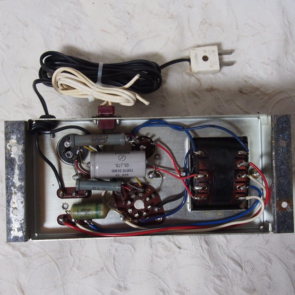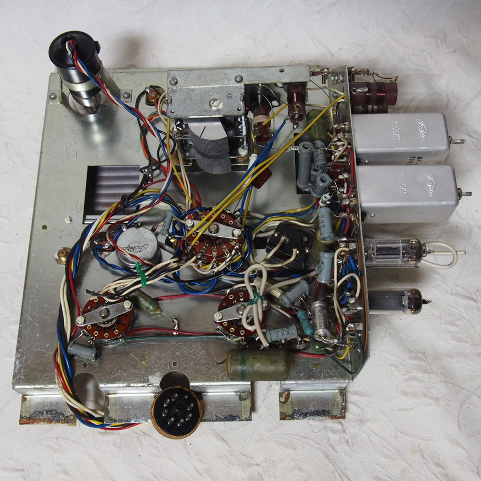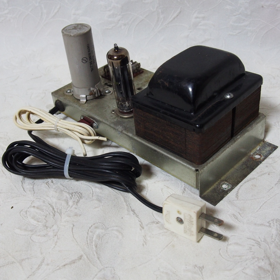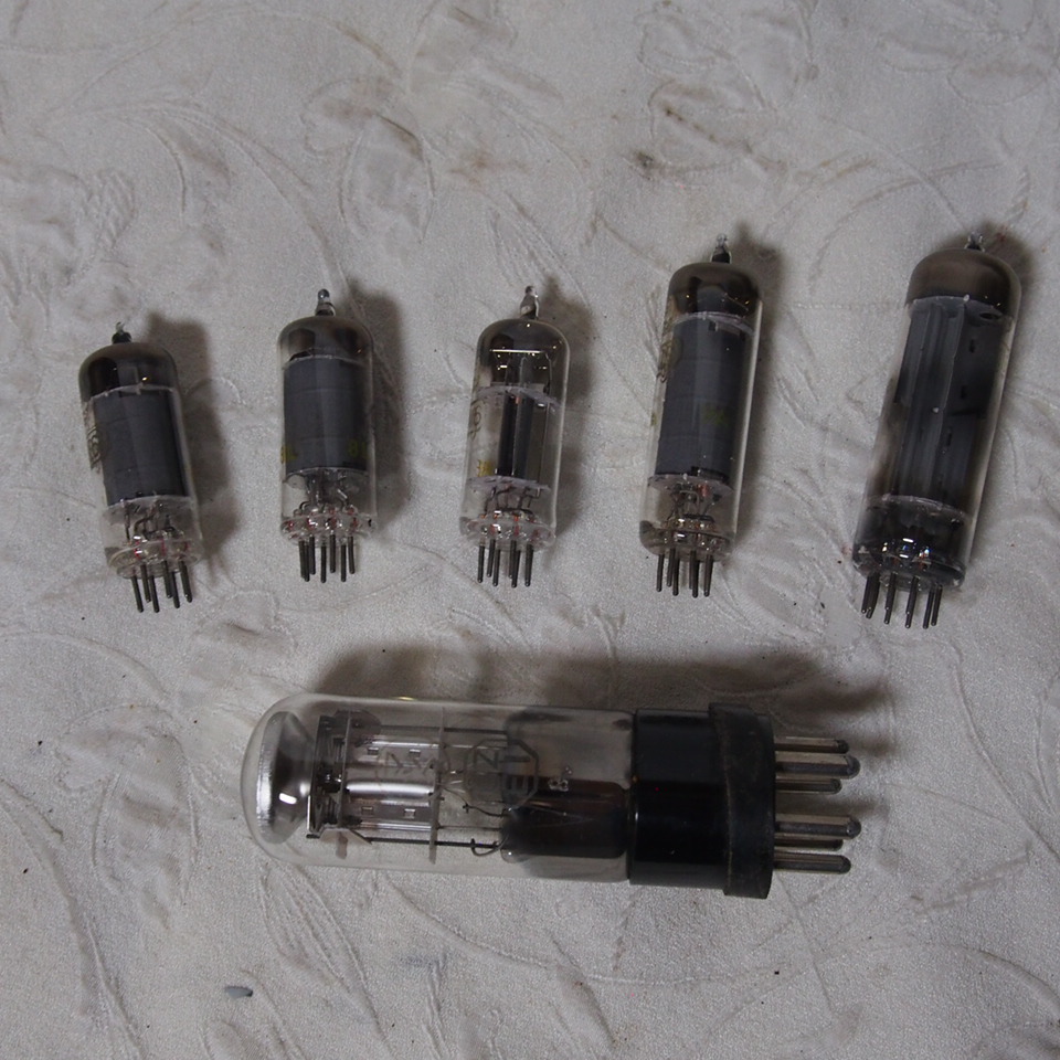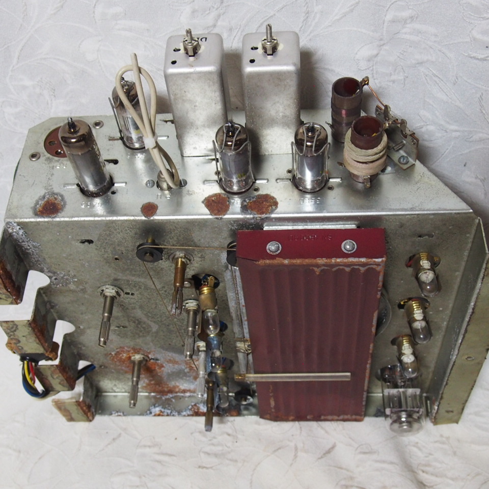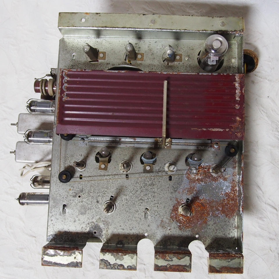 ● 商品説明 ・・・   当方サイドに於いて長年に渡る「蔵出し品」、電気文化物 復元・チェック & クリーニング済み「現状品」、「シャシーをセパレート型」とした トランス式で MT真空管を使用としたラジオです。又、ケース内外部 & シャシー内外部に至っては、汚れ・サビ・等が有りますが、取りあえずは「ノズル式掃除機 & 細長刷毛」で「出来る限りの最大限度」をクリーニング済み のみ としています。① 入手当初から「全てのダイアル摘まみ有り・電源トランスの各端子に導通有り」としています。②  クリーニング & 各ヒーター間の導通を確認済みとした 使用真空管に付いては、「6BE6 / 6AB6 / 6AV6 / 6AQ5 ( ソケットを固定する ボルト & ナットが欠品しています ・・ ) / 5R-K16 / 6E5 ( マジックアイ・グリーン照度は不明です ・・ )」のMT・ST管 合計 6本がセットと成っています。電気文化物 復元・チェック & クリーニング済み「現状品」、「シャシーをセパレート型」とした トランス式で MT真空管を使用としたラジオ」を 部品取り用 として見ては如何でしょうか ・・。 ちなみに商品梱包済みの大きさで「120サイズ」と成っています。