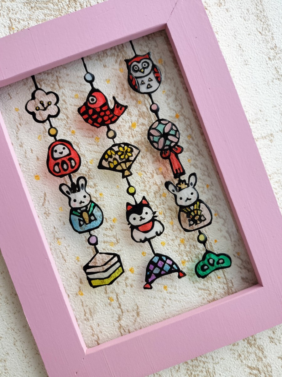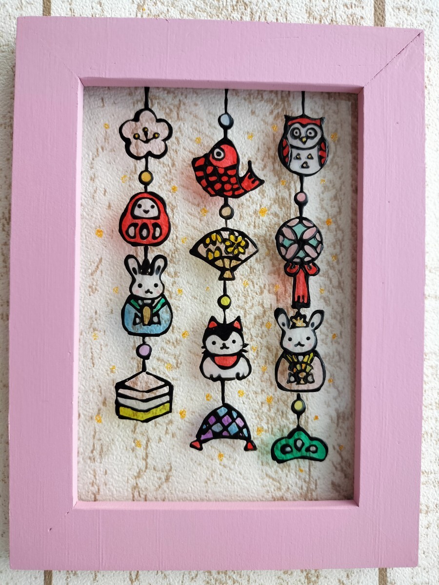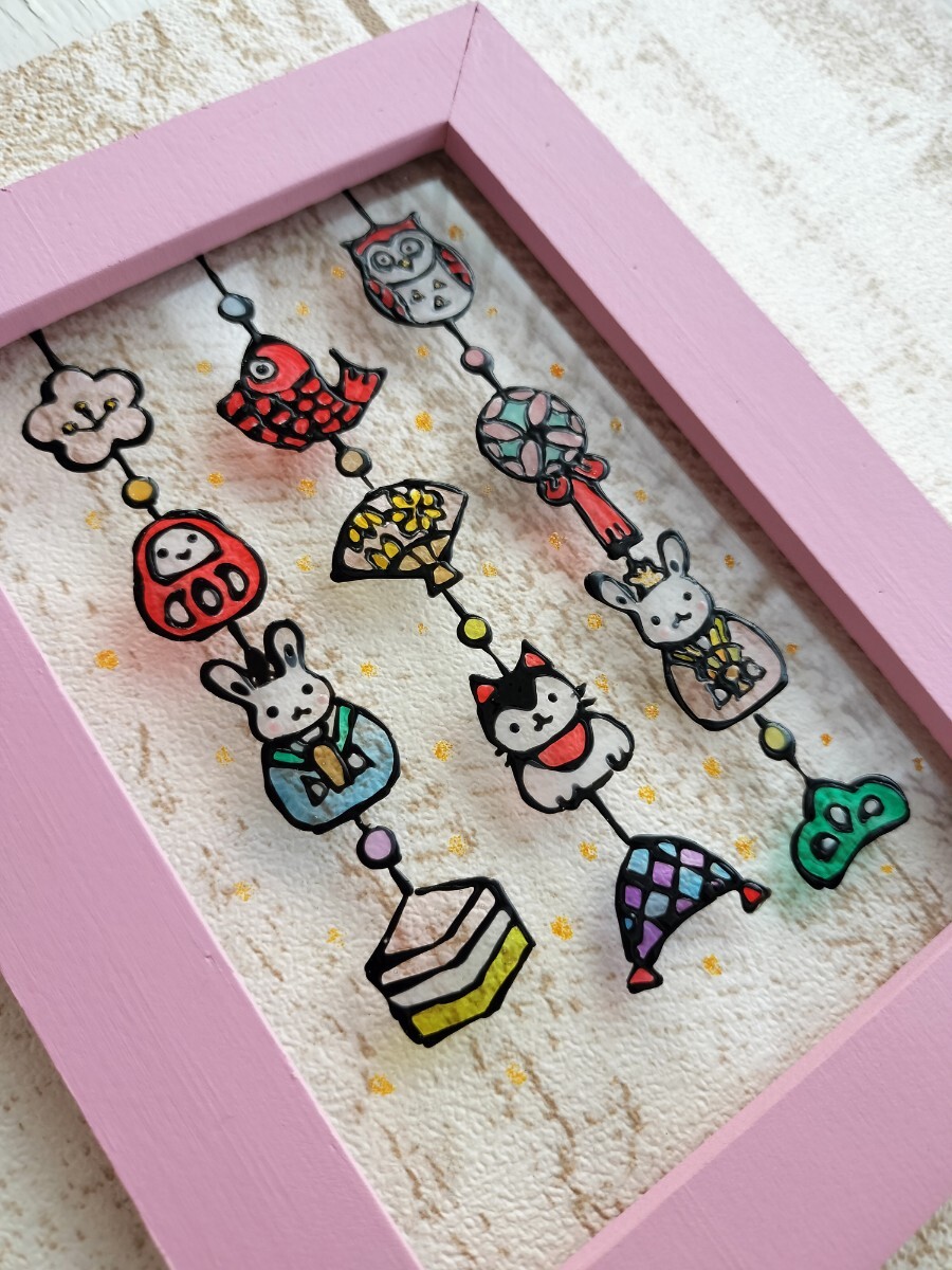 サイズは縦約12cm・横約16cm程度で、ガラス絵の具を使用した薄いアクリルにつるしびなが描かれています^^