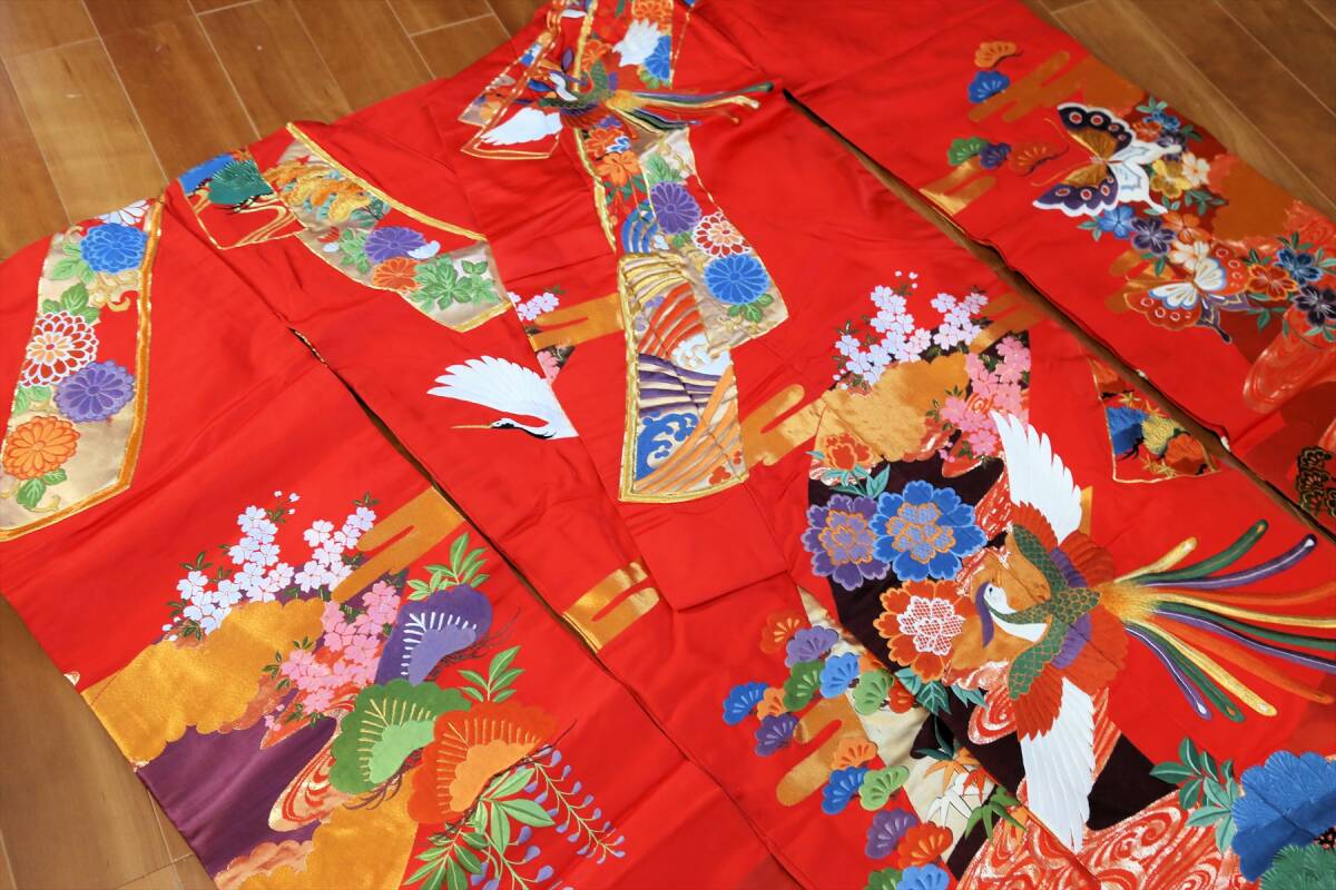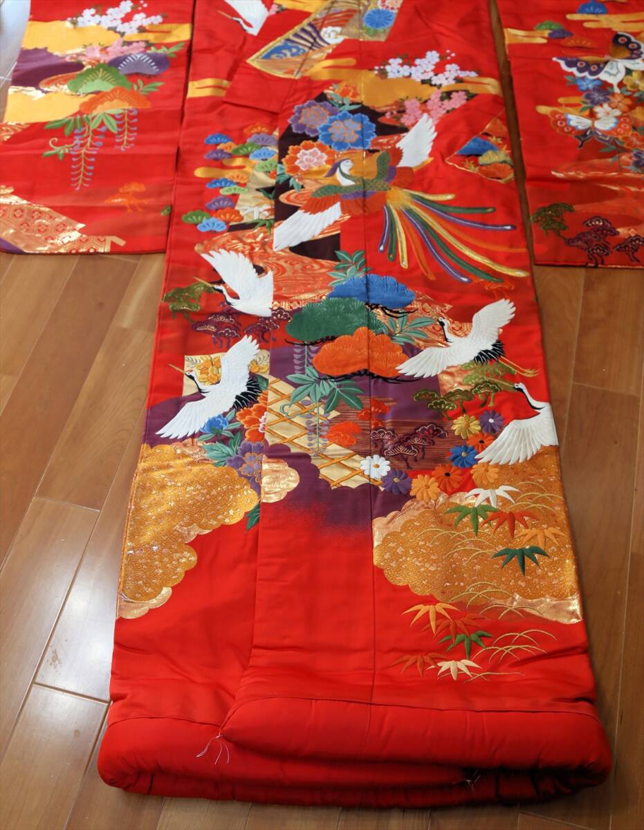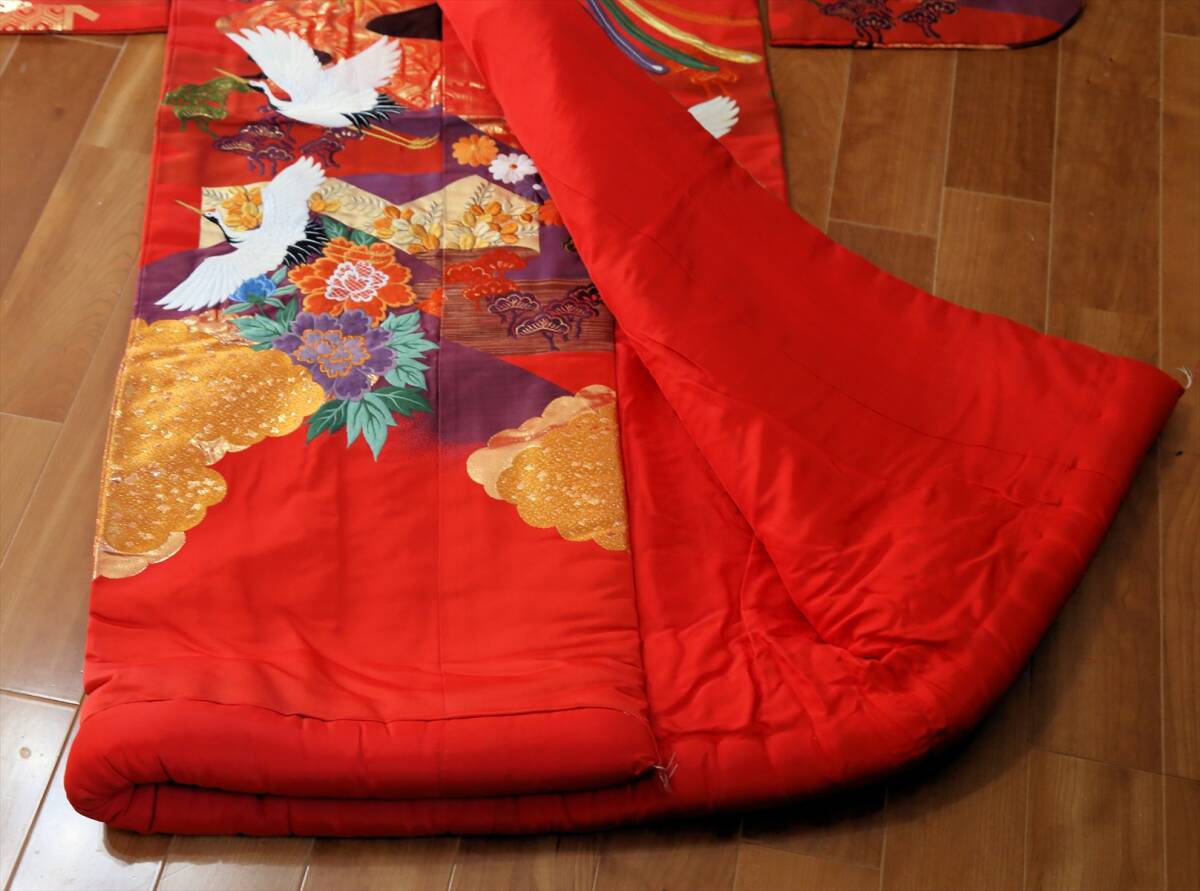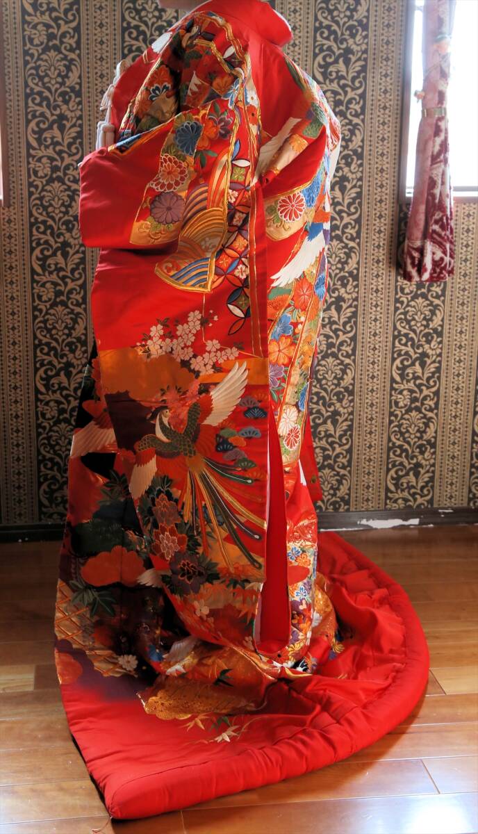 色打掛は通常式場レンタルで50万円以上、購入する場合100万円以上する高級品です、色々な細工が多数施されており、手作業部分も多いとても繊細な品です